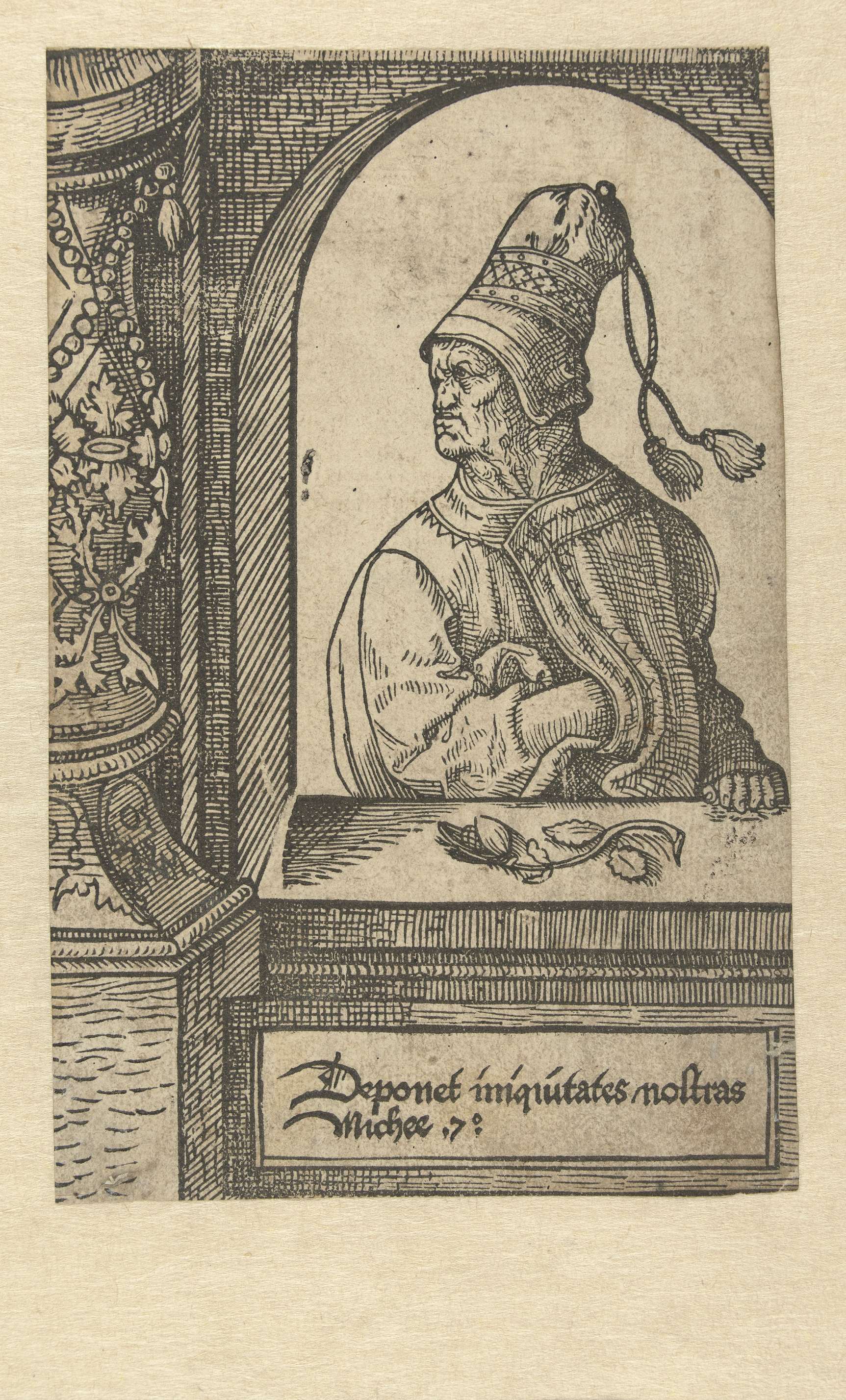 Profeet Micha, ten halve lijven, in rondboog met onderaan regel uit bijbelboek Micha, hoofdstuk 7, vers 19. Links ornamentele versiering.