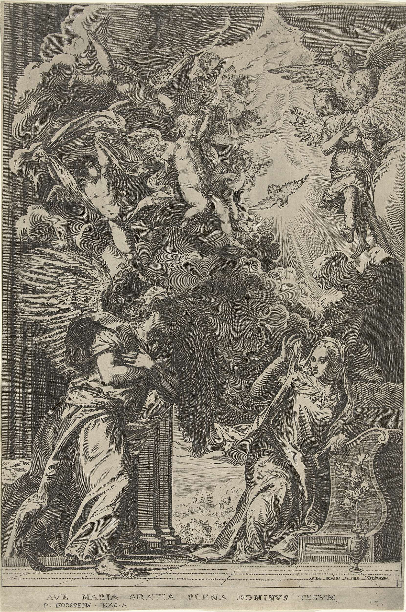 Maria zit geknield op een bidstoel. Ze kijkt om naar de engel Gabriël die achter haar staat. Naast de bidstoel een lelie in een vaas. In de wolken de Heilige Geest in de vorm van een duif en vele engeltjes.