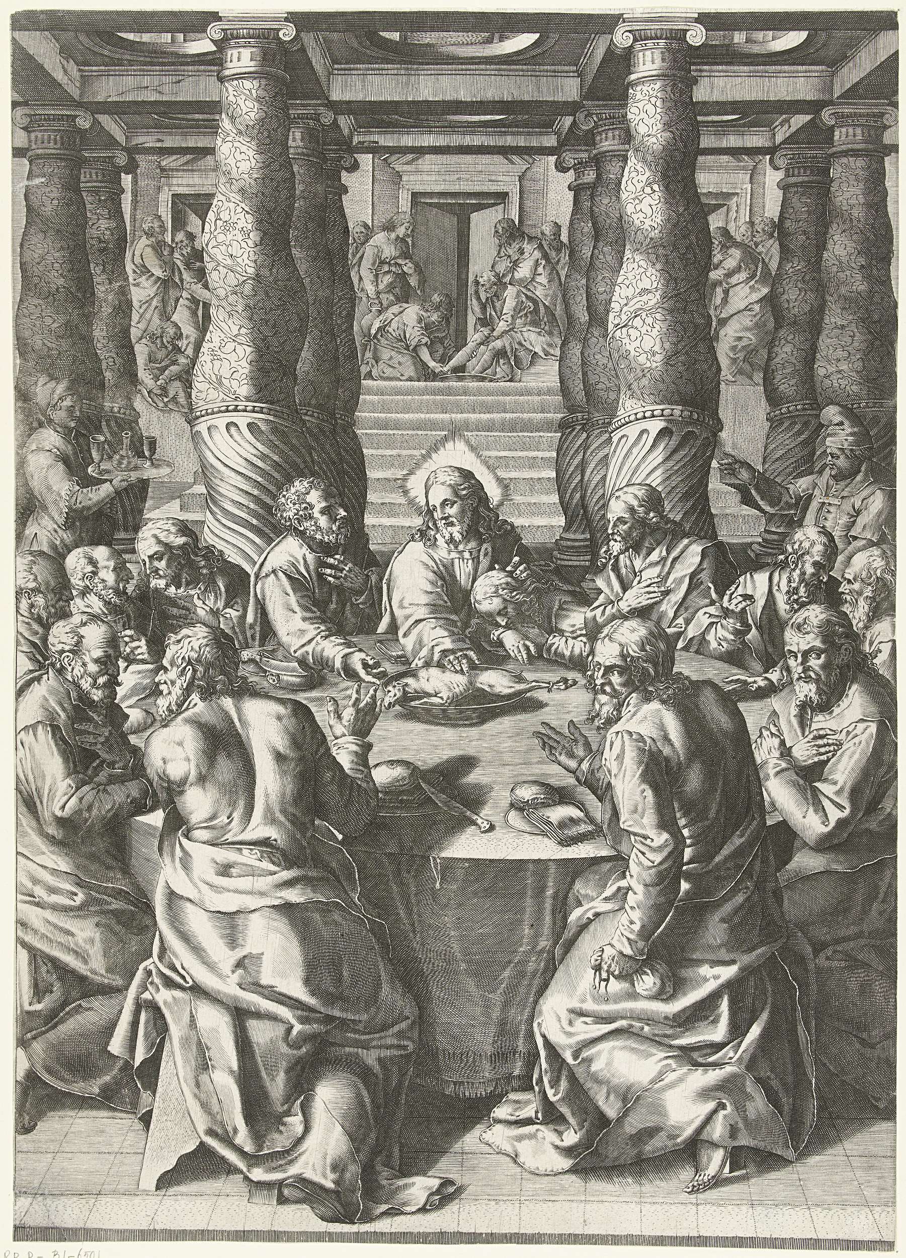 In een ruimte met gedraaide zuilen zit Christus met zijn apostelen aan een ronde tafel aan het laatste avondmaal. Op tafel een schaal met een lam. Johannes zit rechts naast Christus, zijn hoofd op de handen. Rechtsvoor Judas met een beurs in zijn hand. Op de achtergrond tussen de zuilenrij door is de voetwassing te ...