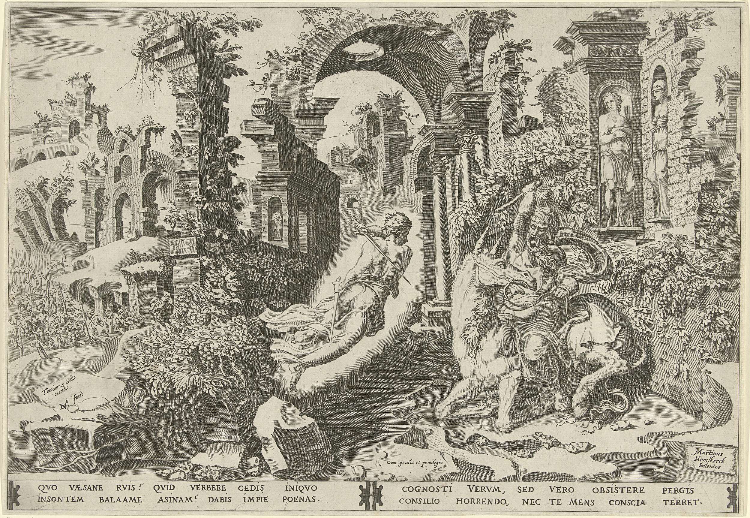 Een landschap met een ruïne. Centraal Bileam op zijn ezel. De ezel van Bileam weigert verder te gaan omdat een engel met een zwaard het dier bedreigt. Bileam slaat zijn ezel met een stok. De prent heeft een Latijns onderschrift