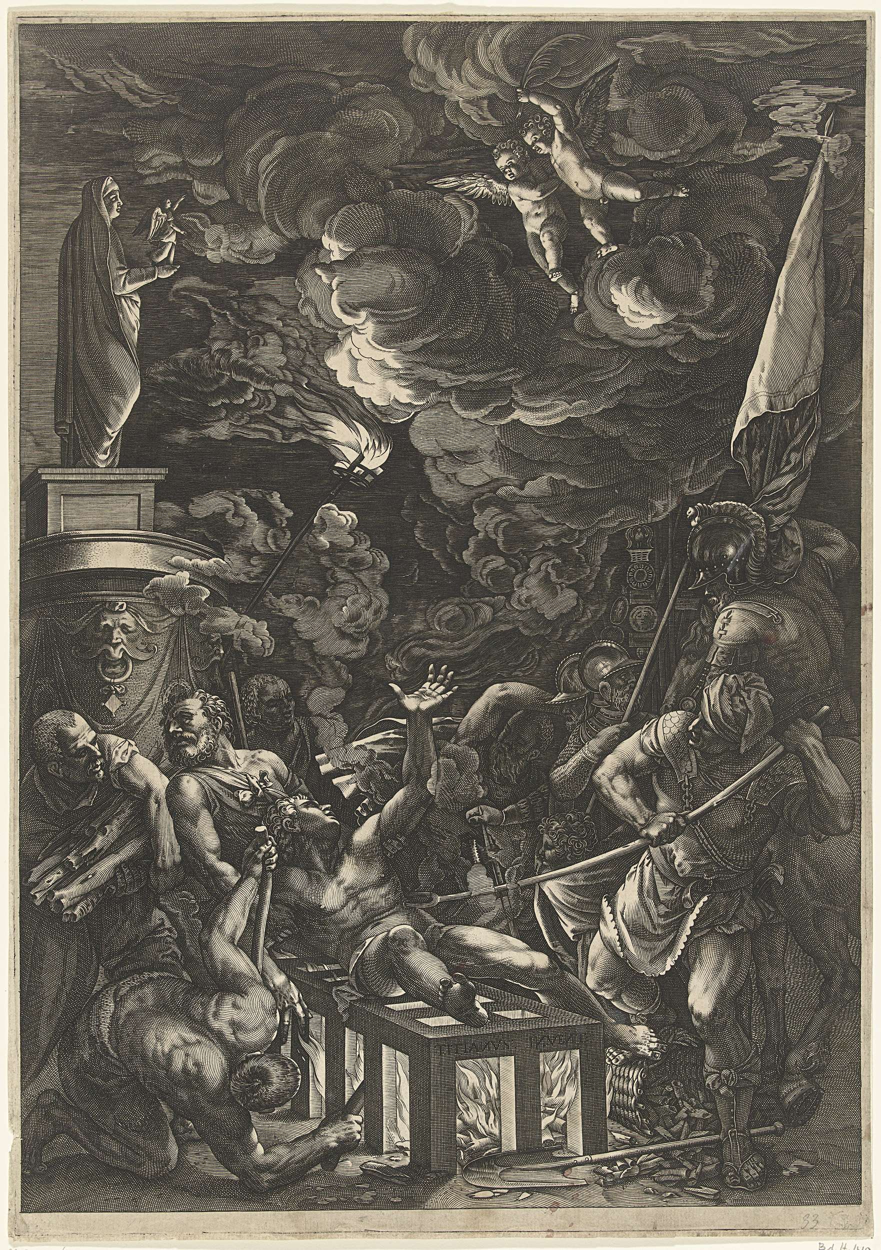 De heilige Laurentius ligt op een rooster en wordt gebraden. Soldaten halen hout voor het vuur, stoken het vuur op en steken met een spit in Laurentius zij. Op de achtergrond een standbeeld van Maria met een engel in haar hand. Twee engelen kijken vanuit de hemel naar de marteling van Laurentius en brengen hem ...