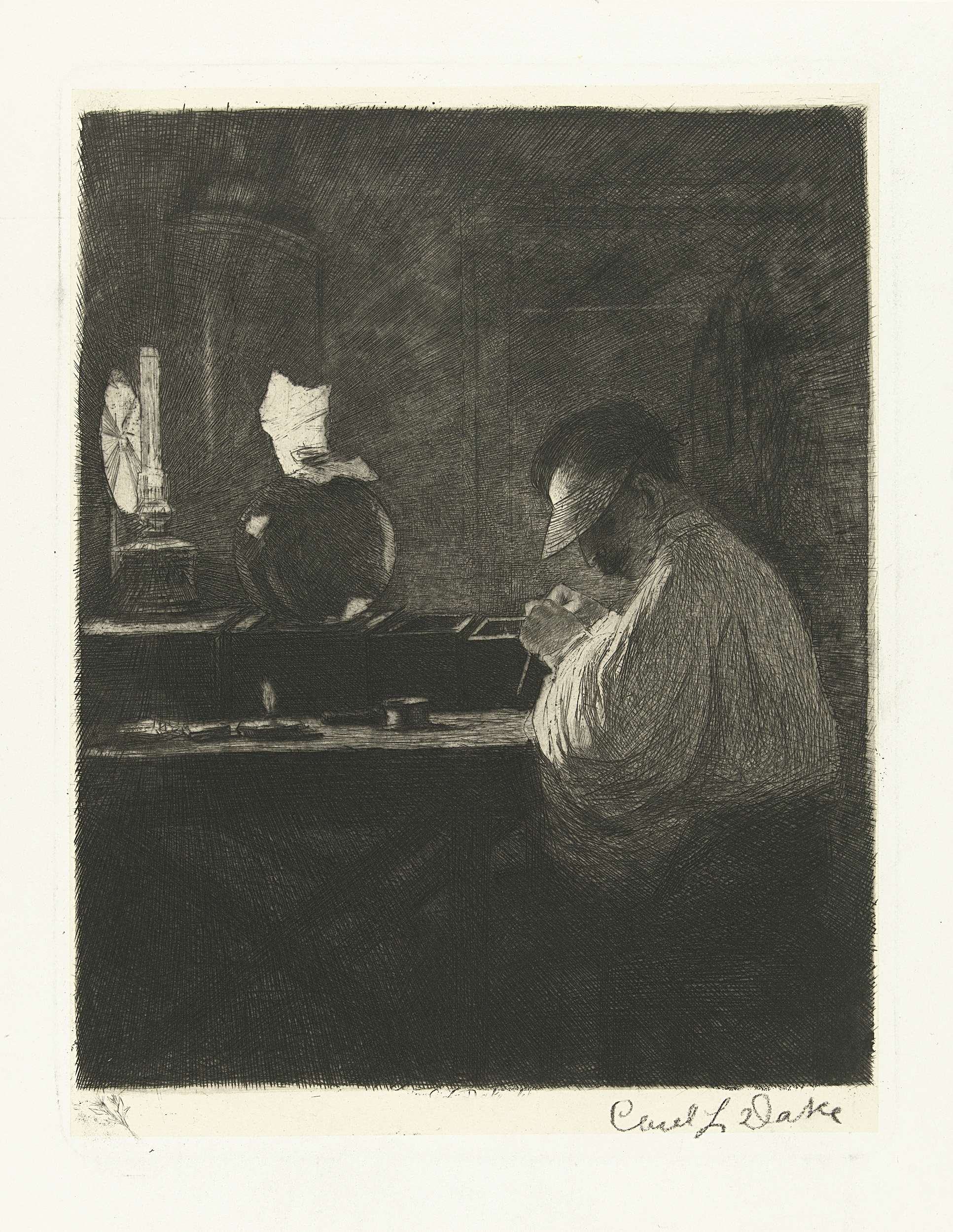 Diamantbewerker aan het werk in zijn werkplaats bij het schaarse licht van een olielamp. In de marge linksonder een kleine remarque met een distel.