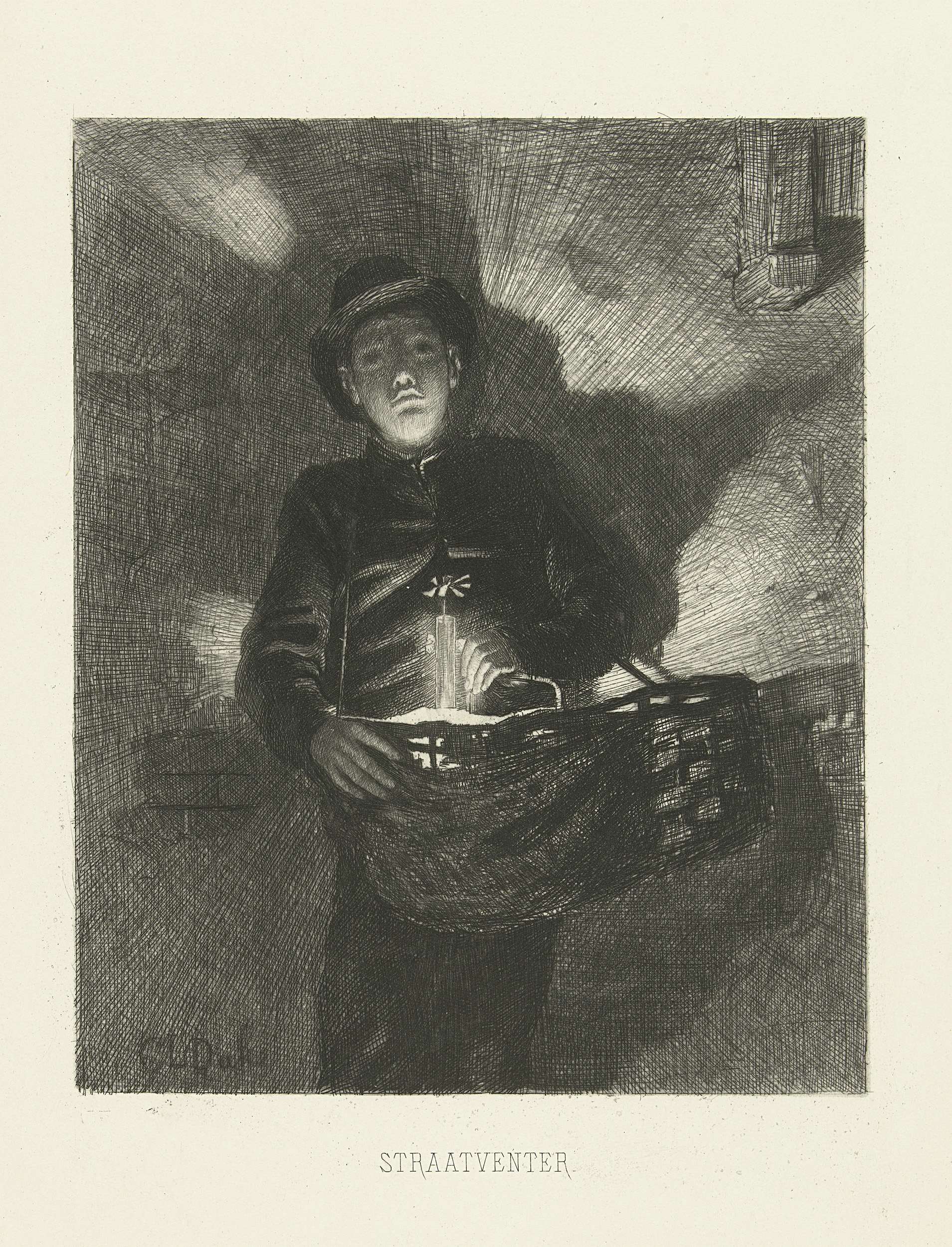 Jongen als straatventer staat met een mand met koopwaren hangend aan zijn schouder voor een muur bij avond. In de mand brand een kaars welke het gelaat van de jongen van onderen belicht en waardoor er een grillige schaduw valt op de muur achter hem.
