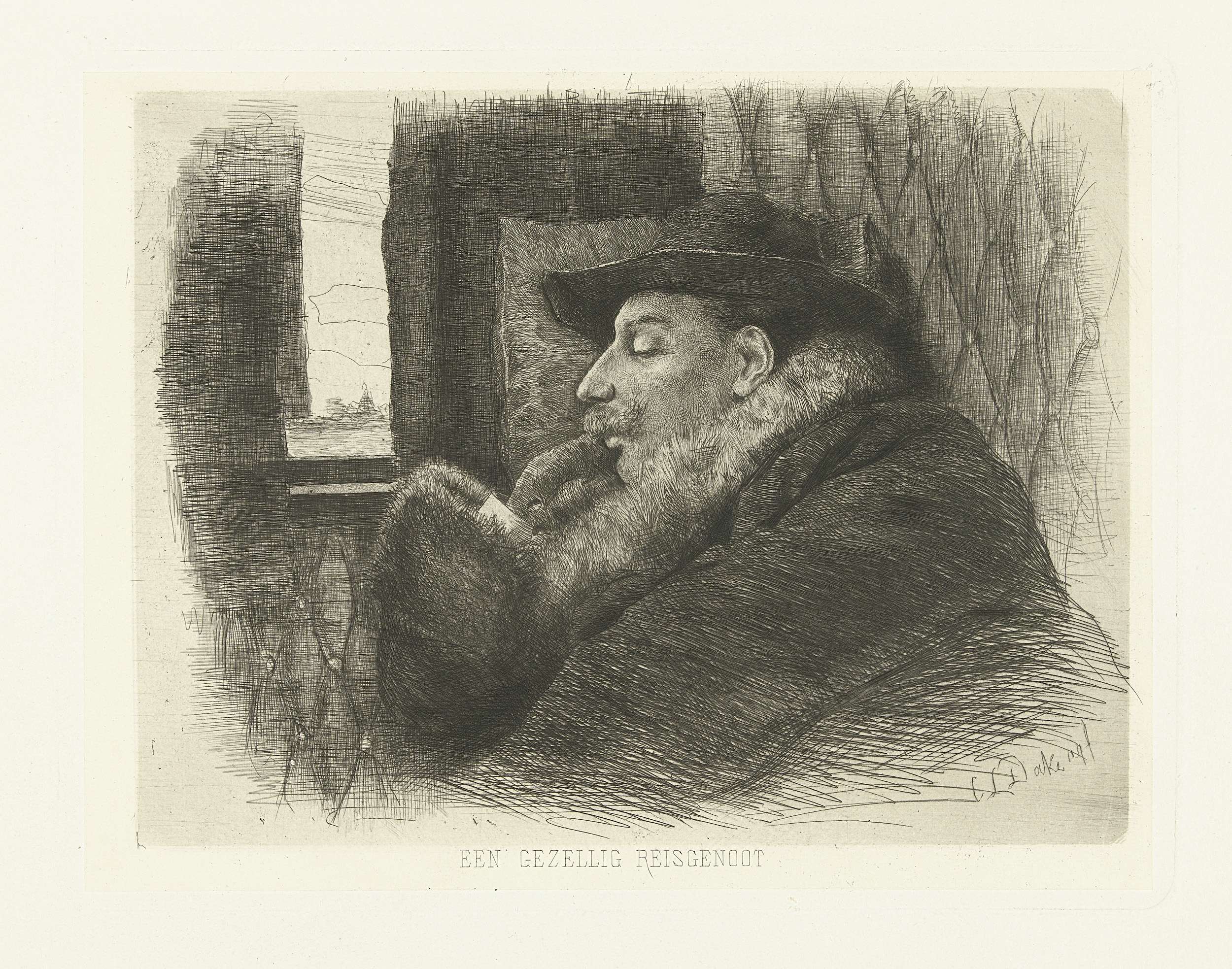 Man met hoed en jas met bontkraag leunt slapend met zijn hoofd tegen de wand in interieur van een rijtuig. De gordijntjes voor het venster zijn half gesloten en daarbuiten is een glimp van het landschap zichtbaar.