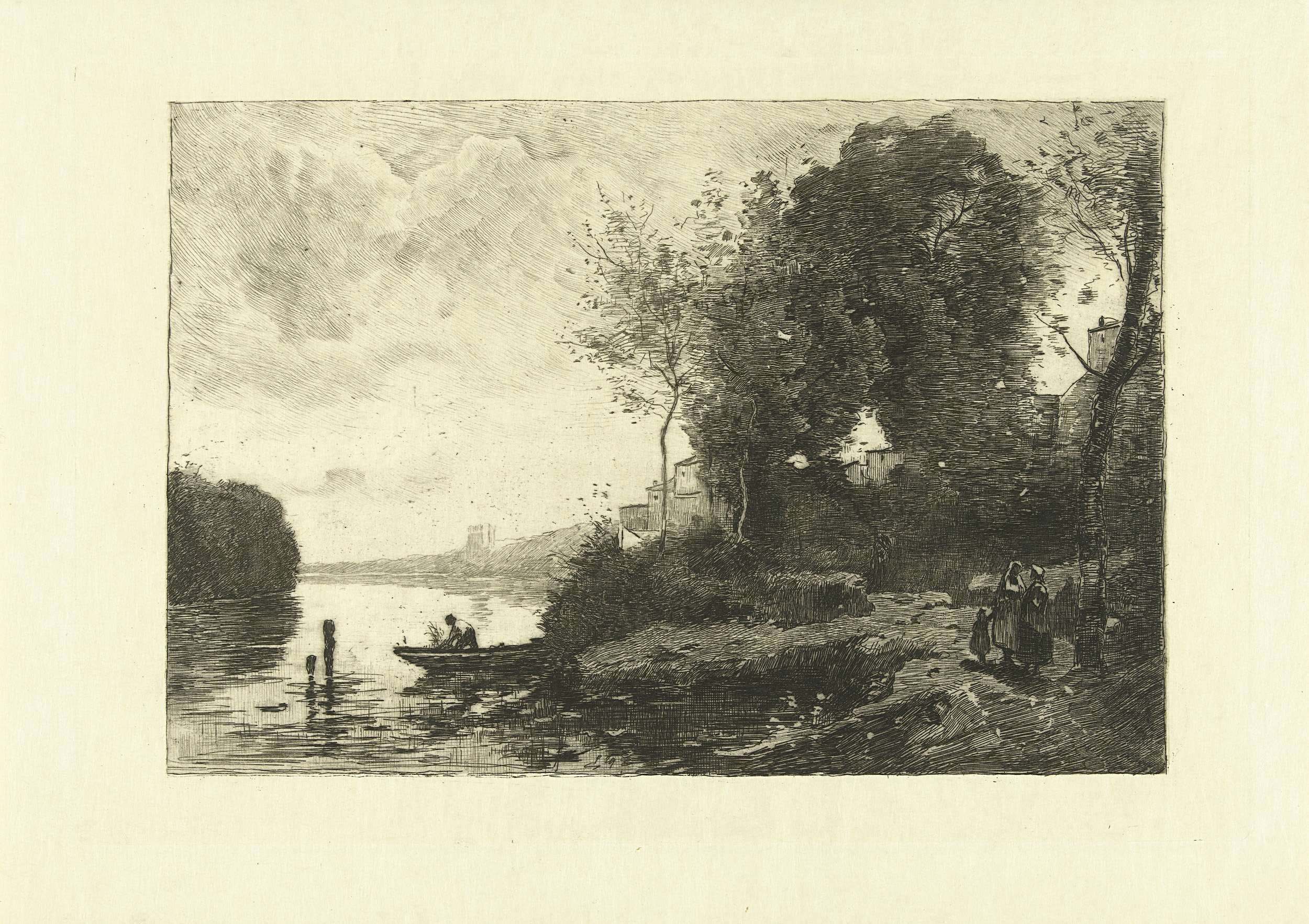 Landschap met bomen en huizen aan rivier