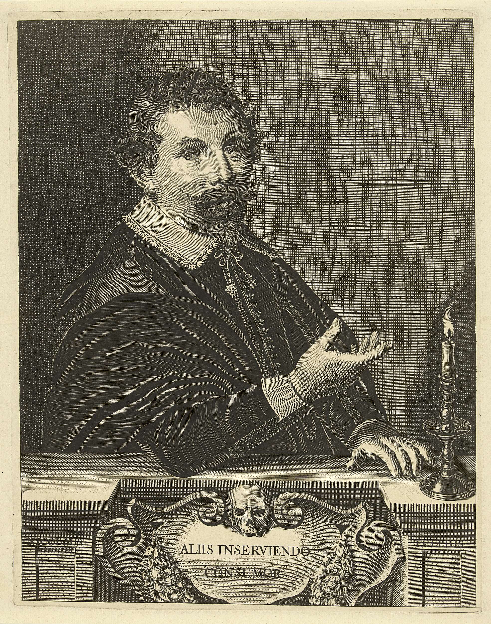 Portret van Nicolaas Tulp, ten halven lijve achter balustrade. Hij wijst met zijn vinger naar een kaars die opbrandt, een gebaar dat nog eens onderstreept wordt door het motto op een cartouche met schedel: Aliis inserviendo consumor.