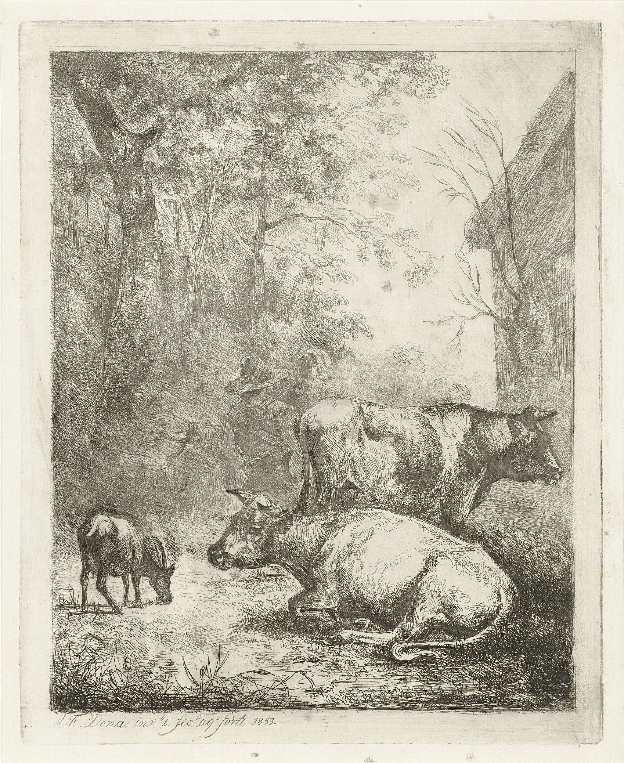Boerenerf met twee koeien, een bokje en een pratend stel