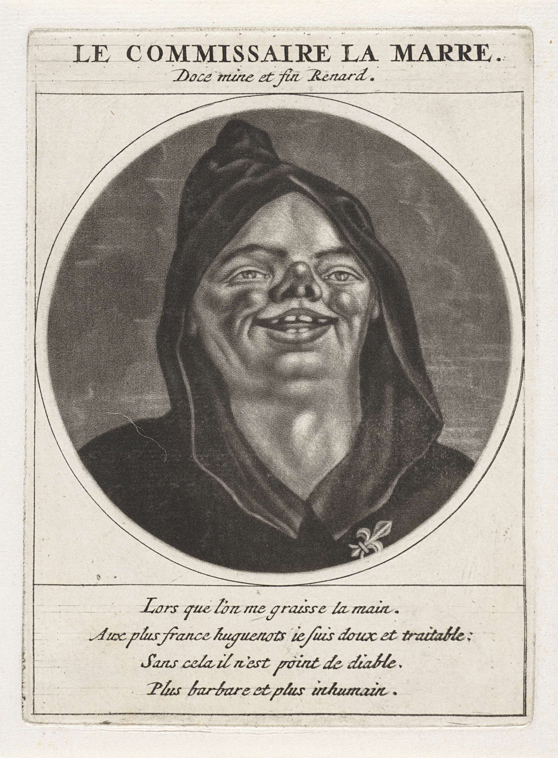 Nicolas de La Mare in een pij, met op de borst een Franse lelie. De prent maakt deel uit van een serie met spotprenten op Lodewijk XIV en zijn gevolg.