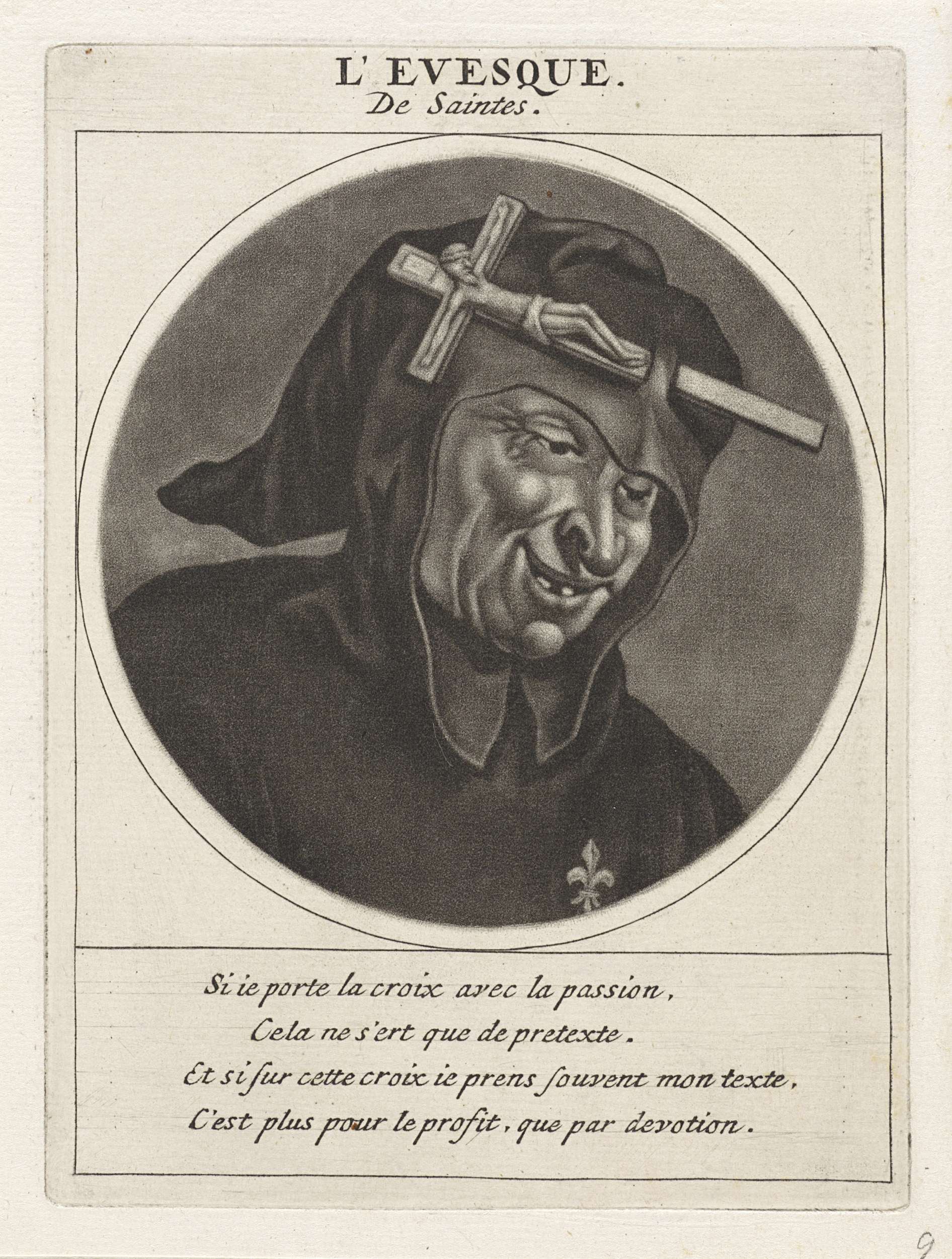 Guillaume de La Brunetière, bisschop van Saintes. Hij draagt op zijn borst een Franse lelie en heeft een crucifix op de kap van zijn pij. De prent maakt deel uit van een serie met spotprenten op Lodewijk XIV en zijn gevolg.