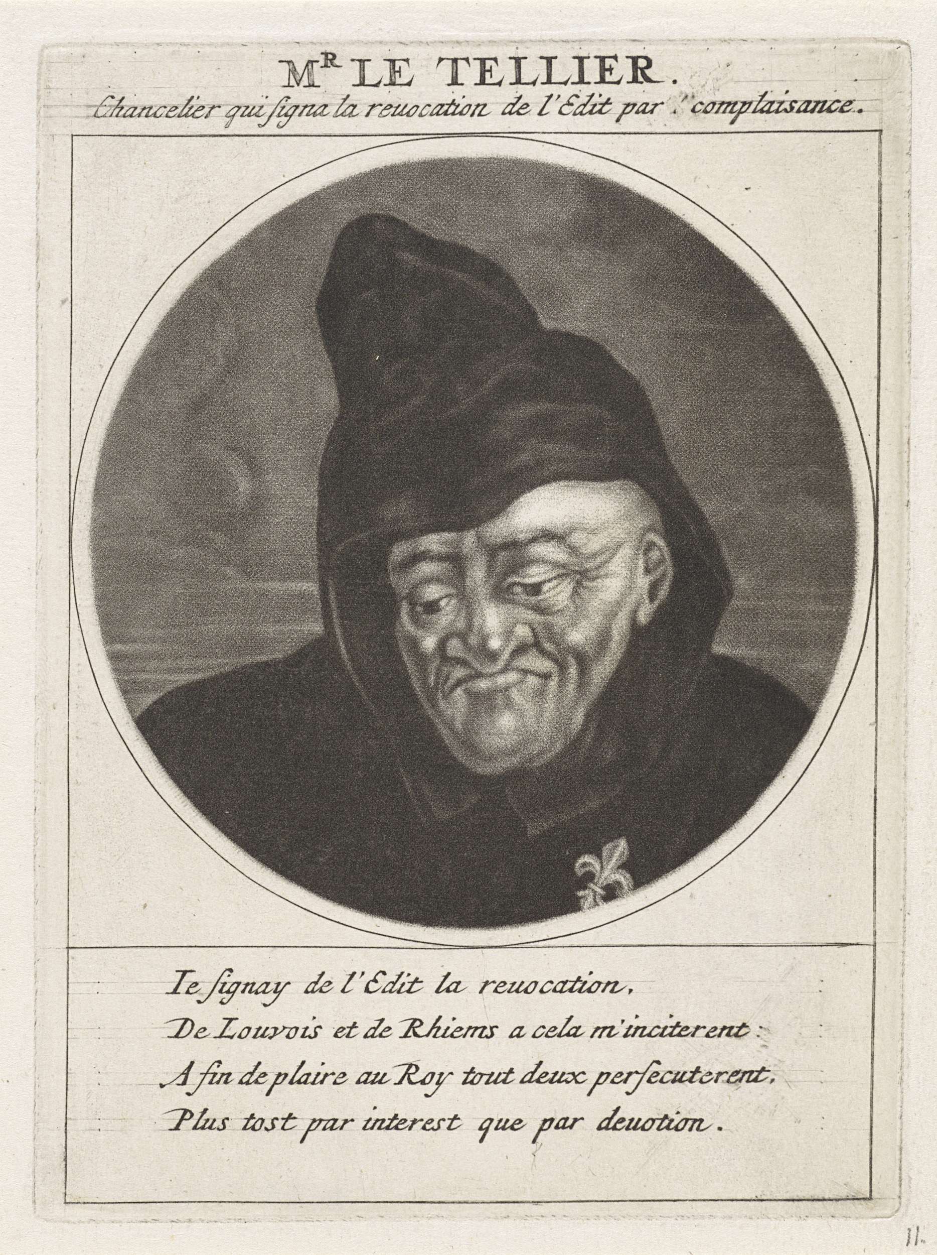 Michel Le Tellier, marquis de Barbezieux en kanselier van Frankrijk. Hij draagt een pij met de Franse lelie. De prent maakt deel uit van een serie met spotprenten op Lodewijk XIV en zijn gevolg.