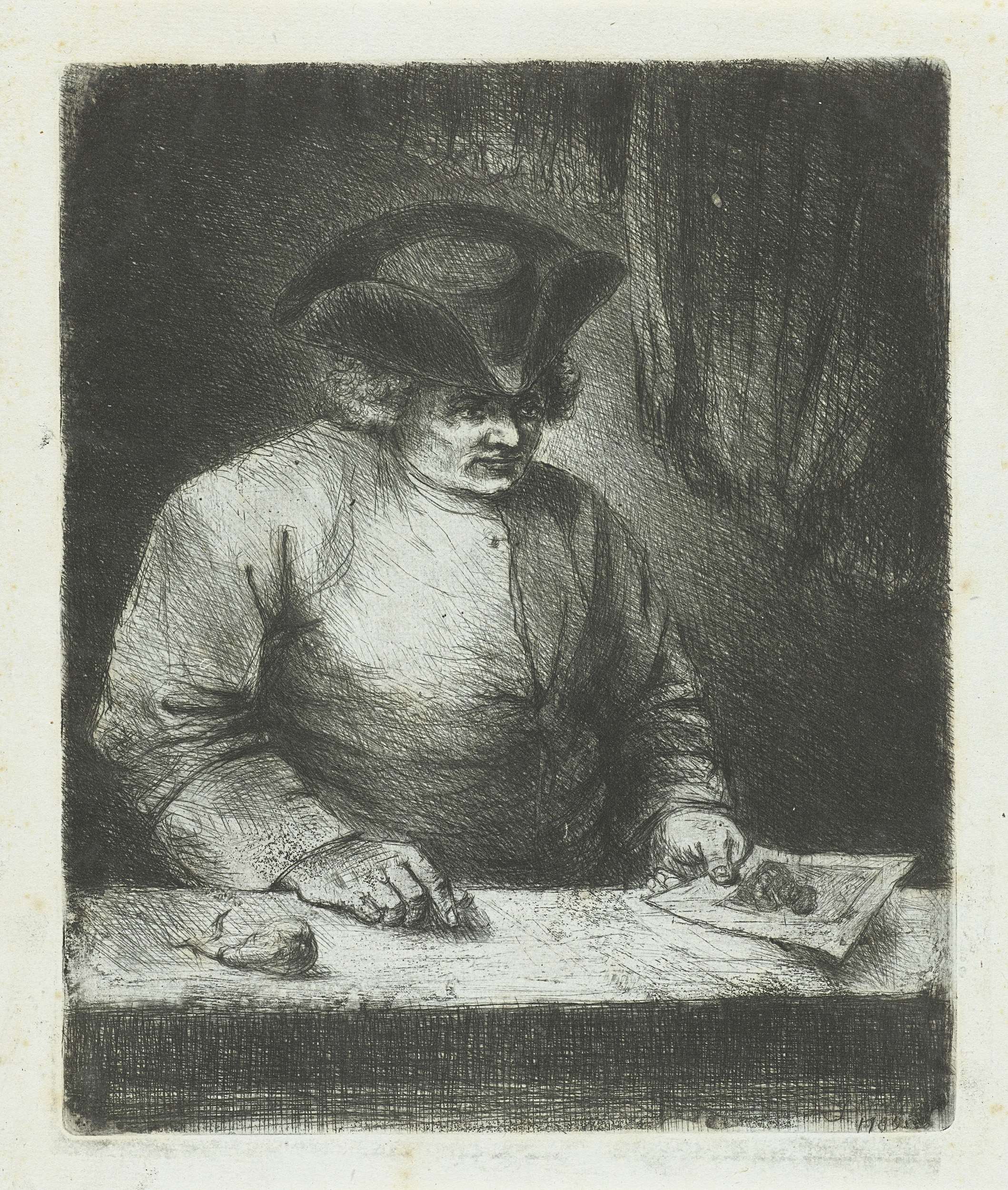 Portret van Hendrik Chalon, tekenaar en vader van de prentmaker. Hendrik staat met buste naar rechts voor een tafel en bestudeert een prent die hij in zijn linkerhand houdt. op zijn hoofd draagt hij een steek. Links op het tafeltje ligt een peer.