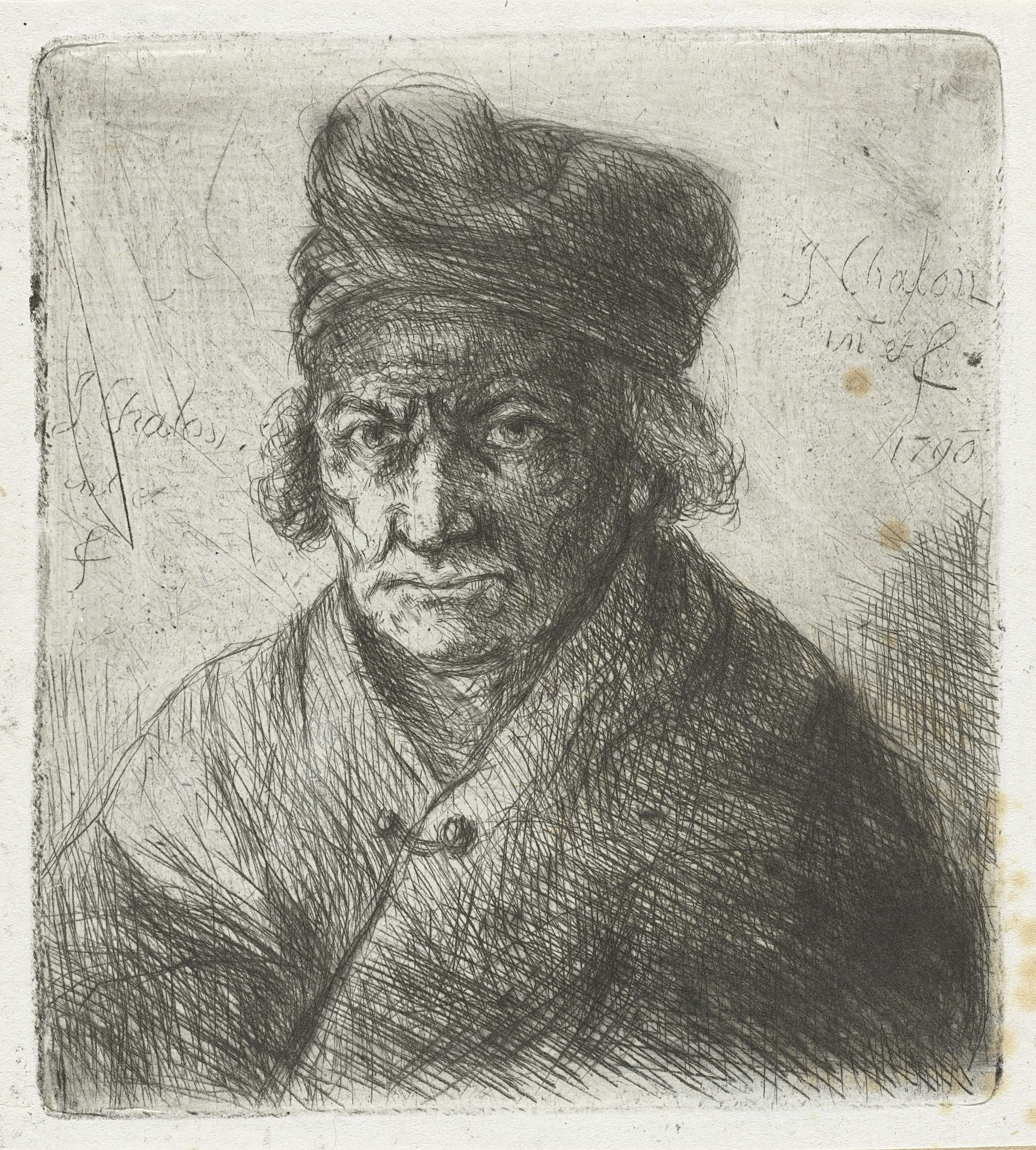Een oude man met muts. Buste licht naar links.