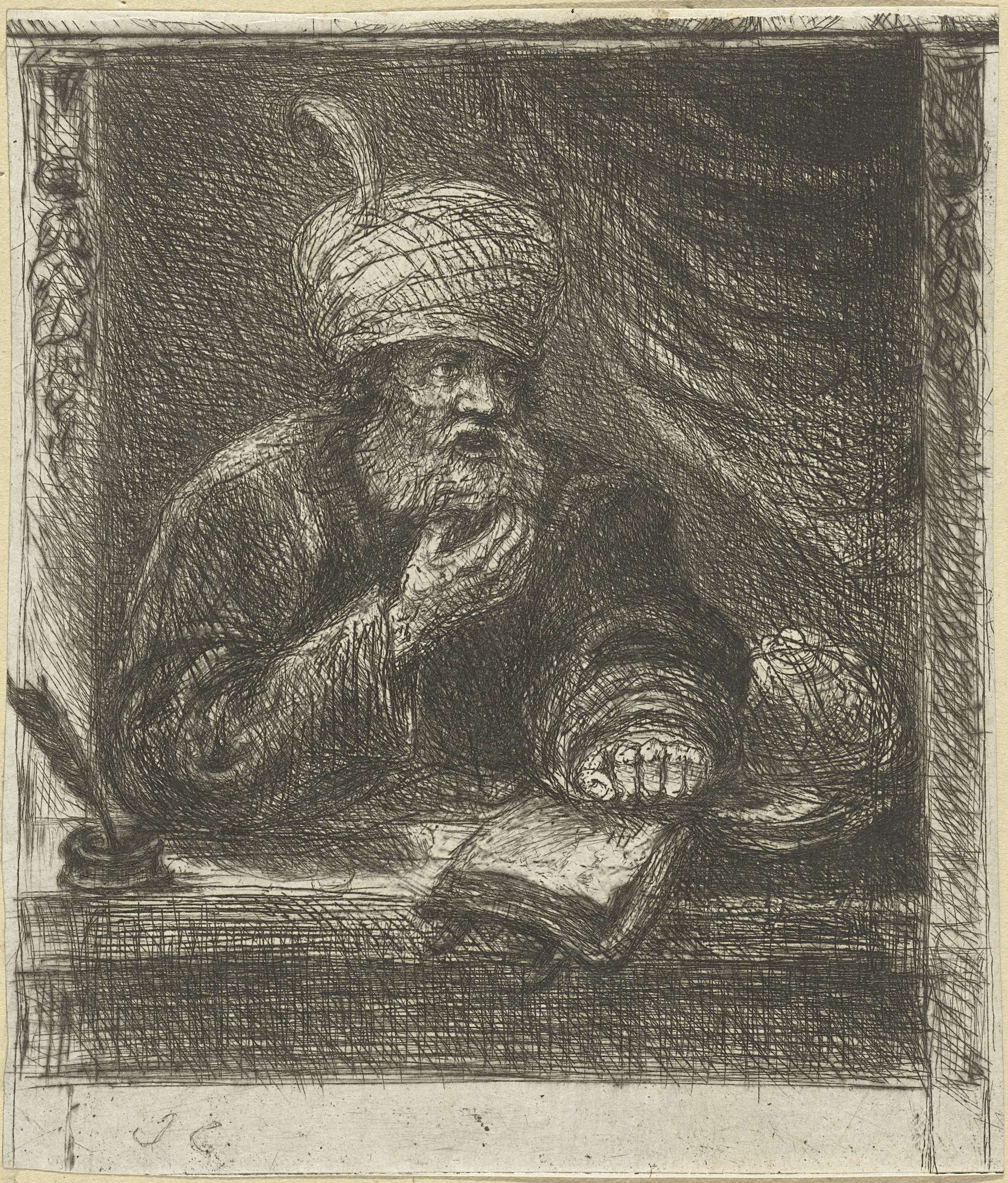 Een man met een tulband zit achter zijn bureau. Hij leest in een boek. Links van de prent ligt schrijfgerief. Rechts een globe.