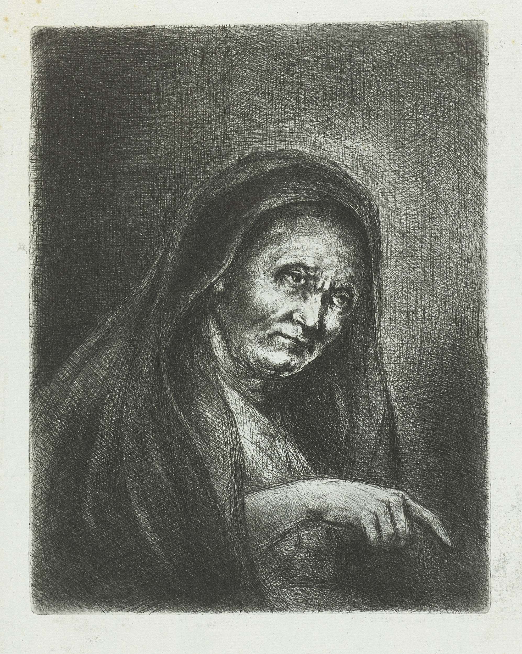Een oude vrouw. Buste naar rechts. Ze draagt een hoofddoek en wijst naar rechts.