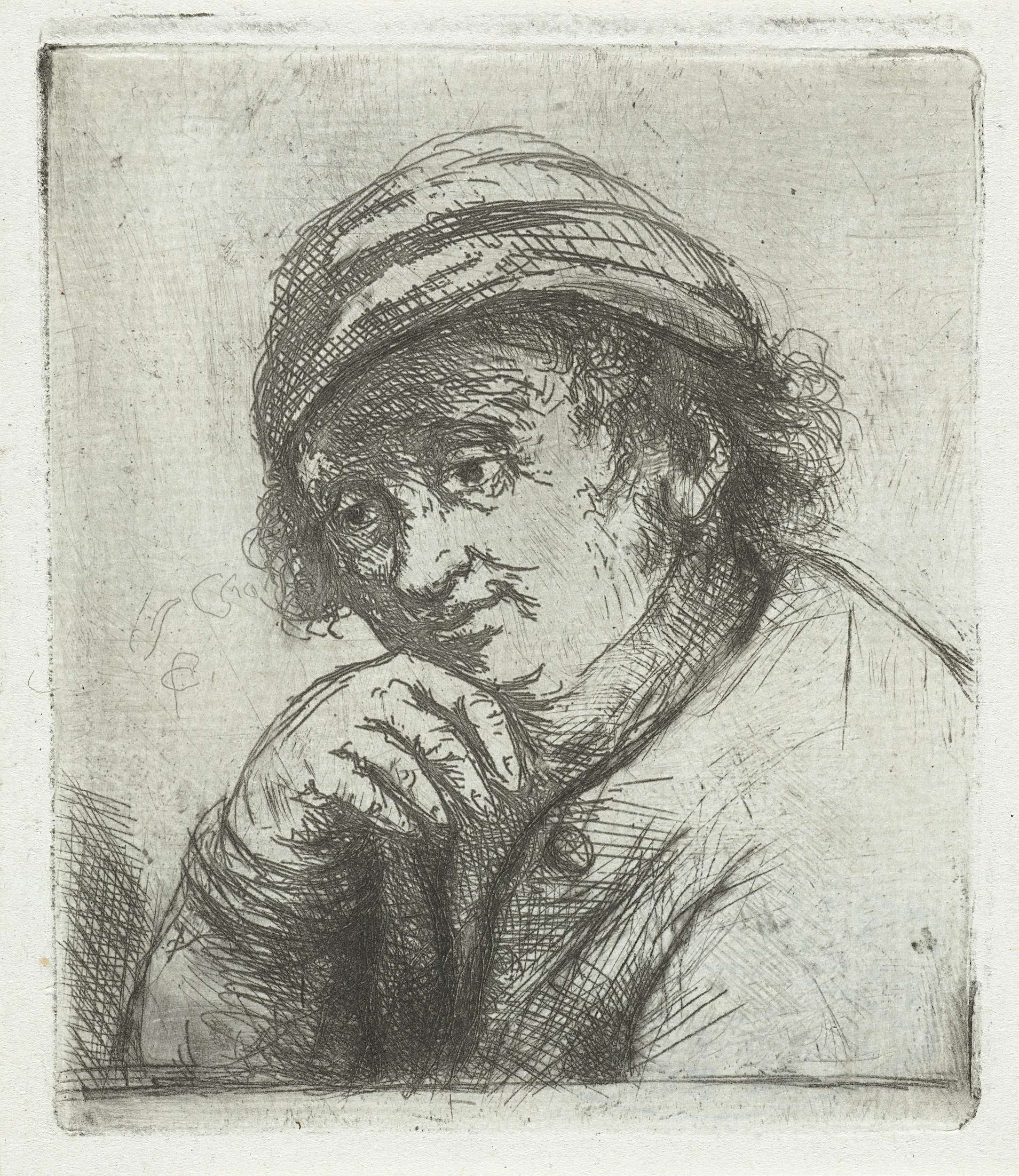 Een volwassen man met muts. Hij ondersteunt zijn hoofd met zijn rechterhand. Buste naar links.