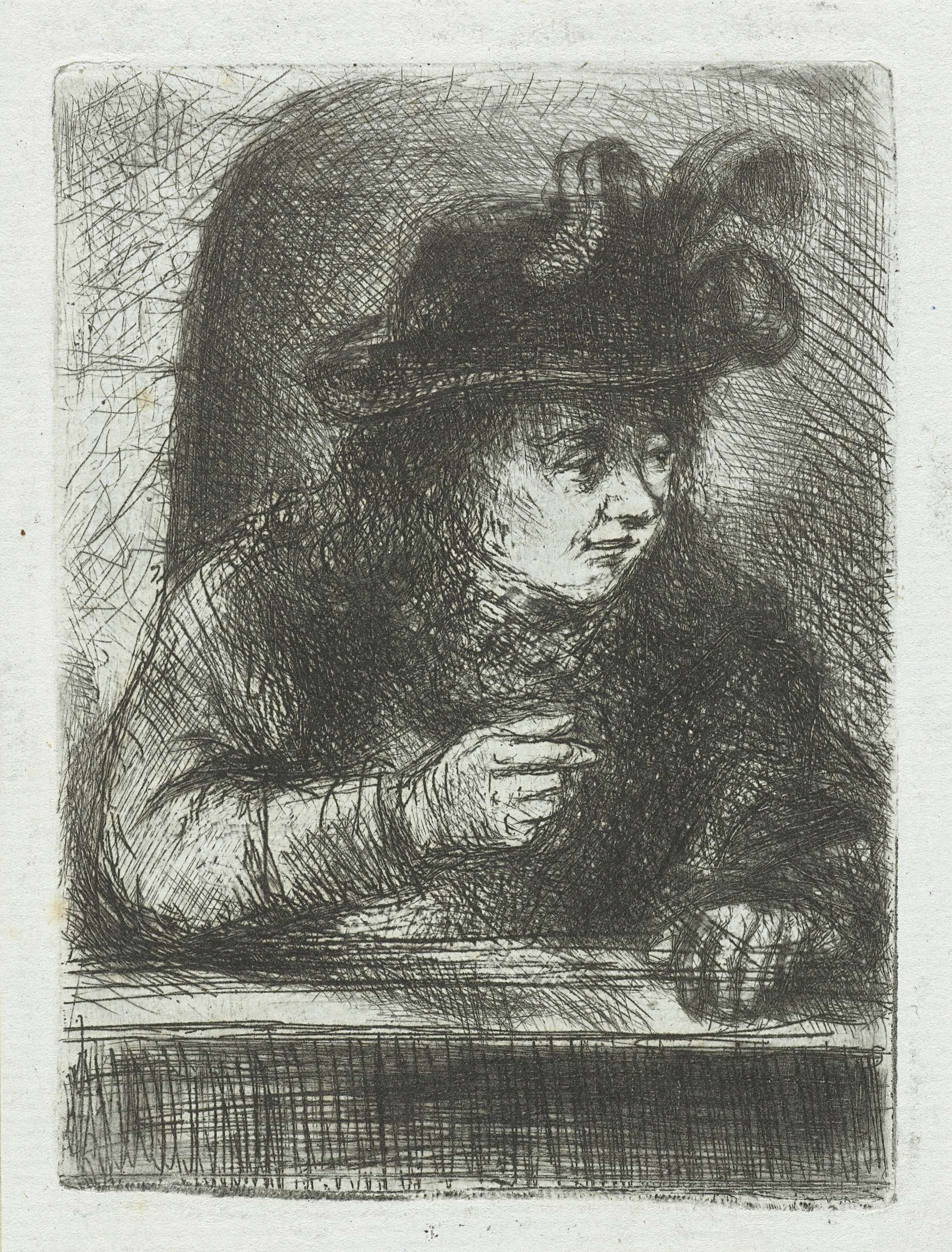 Een volwassen man met hoed met veer staat naast een balustrade. Buste naar rechts.