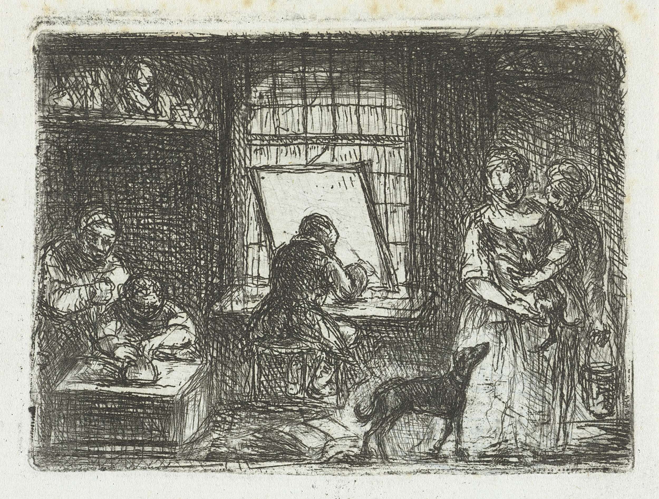 Een werkatelier, mogelijk van de prentmaker zelf. Links op de voorgrond is een man een prent aan het maken. Iemand kijkt over zijn schouder mee. Op de achtergrond in het midden van de prent zit een vrouw te tekenen. Rechts twee vrouwen die een hond eten geven.
