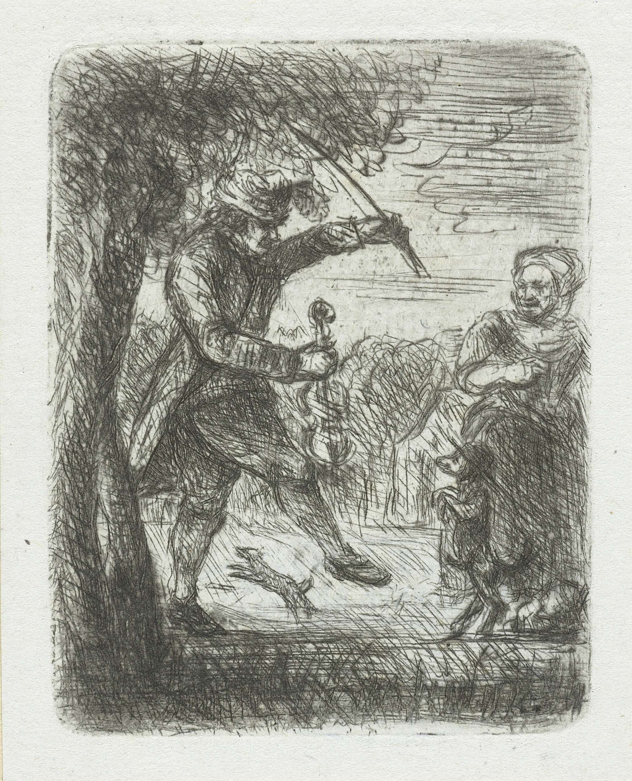 Een straatmuzikant speelt viool voor een jonge dienstmeid. Twee honden dansen rondom hem.