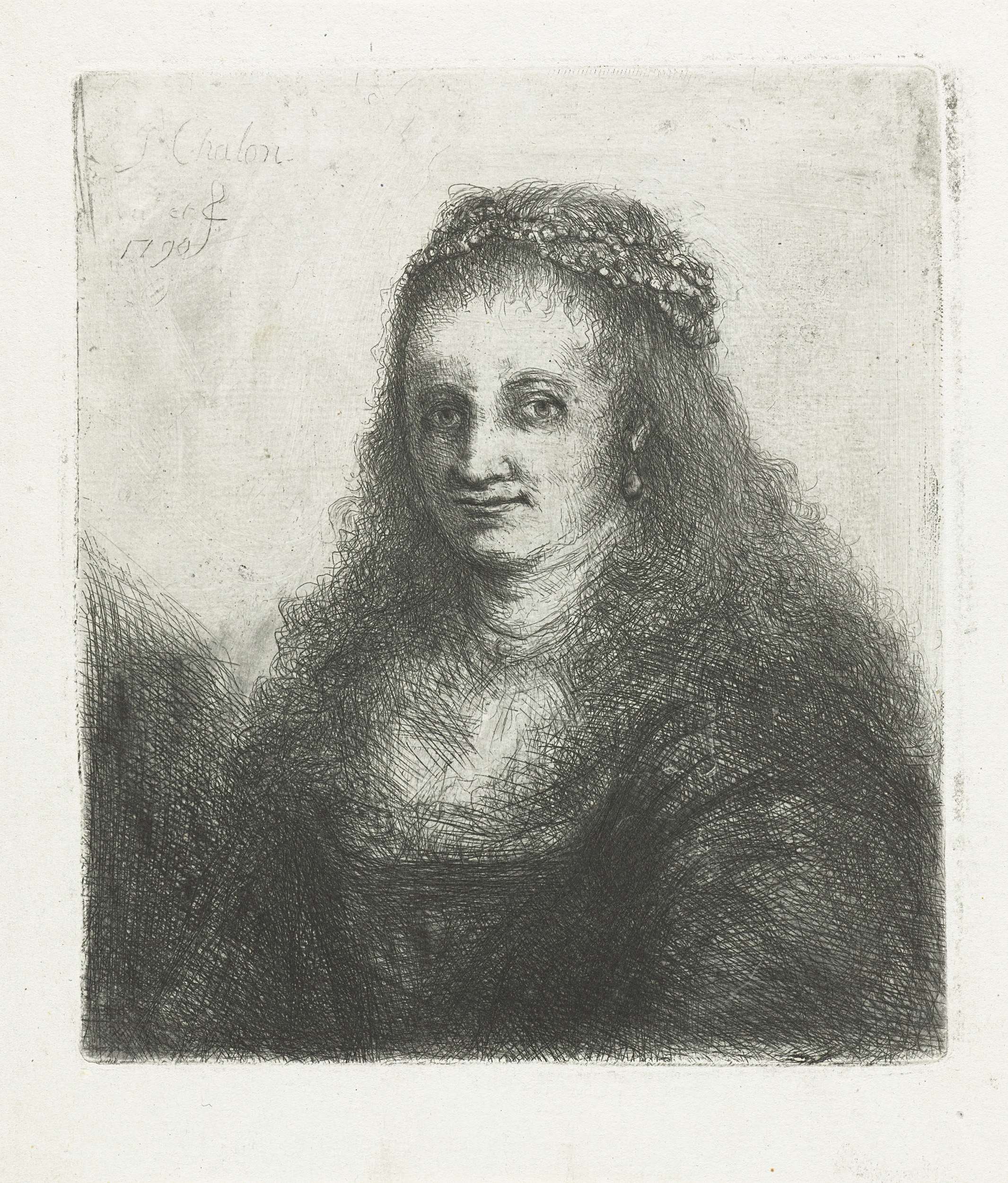 Een jonge vrouw. Buste naar links. Ze draagt een parelsnoer in het haar.