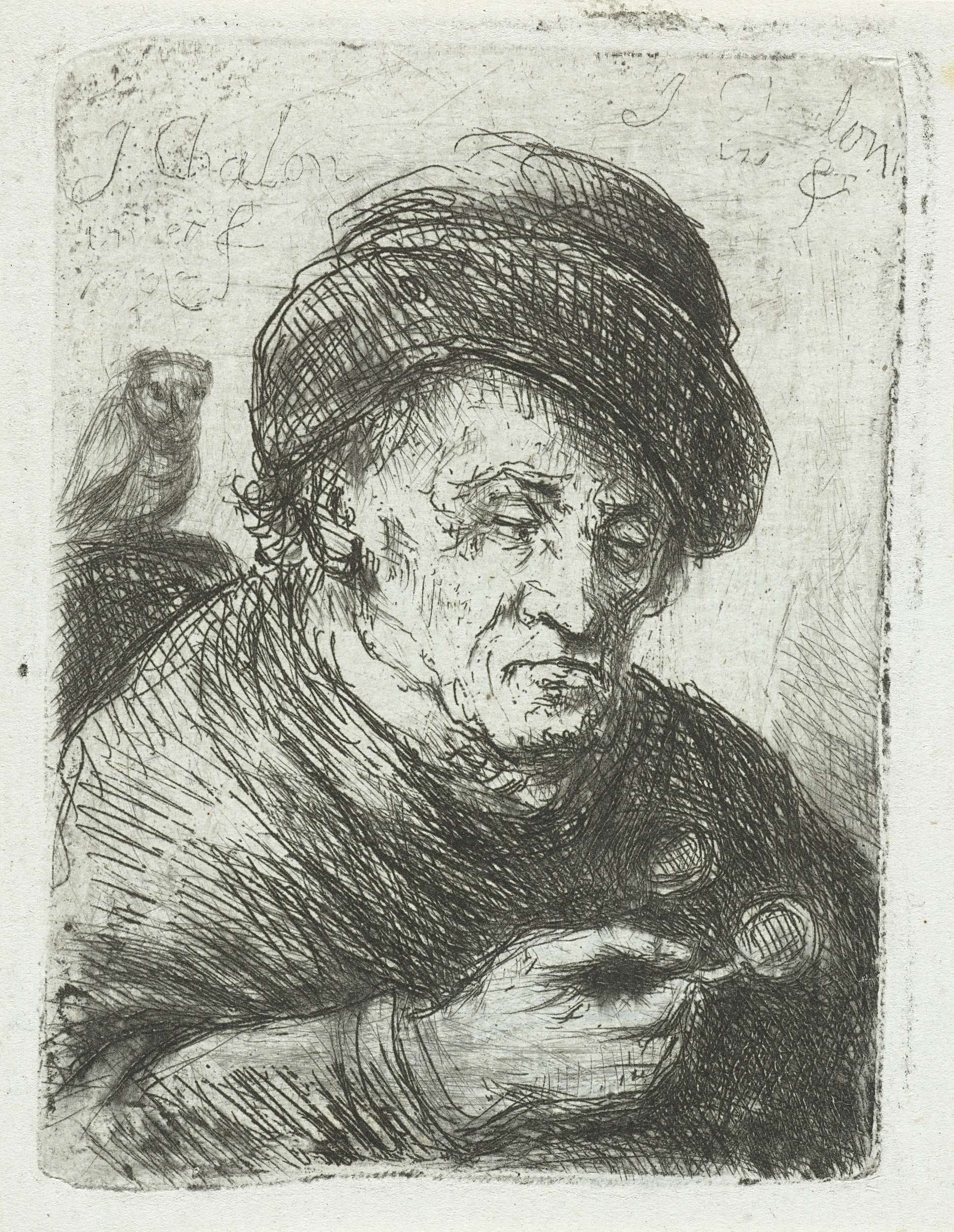 Een oude man met hoed en bril in de hand. Buste naar rechts. Op de stoelleuning een uil.