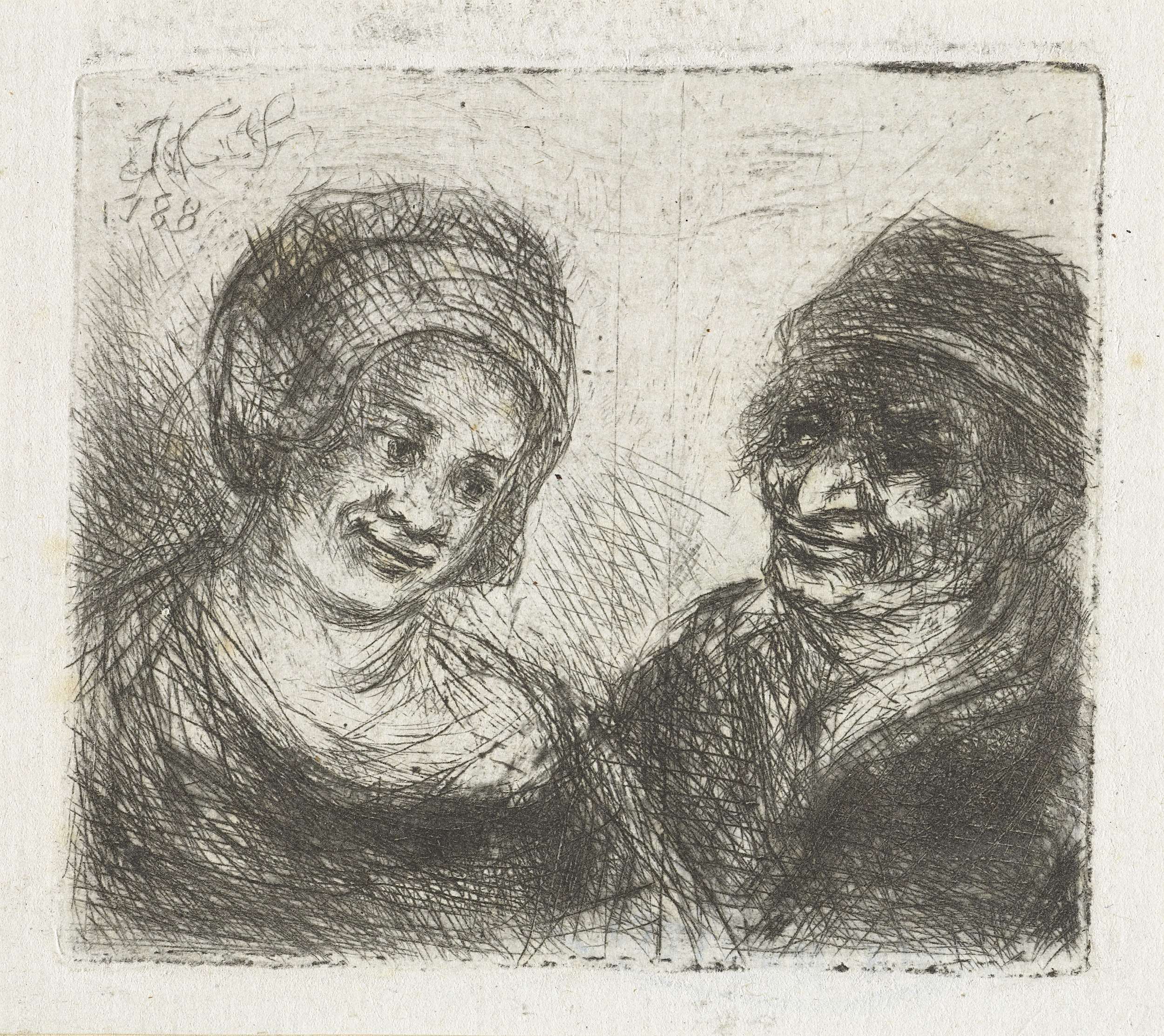 Een boer en een boerin. Links staat de boerin met buste naar rechts. Rechts staat de boer met buste naar links.