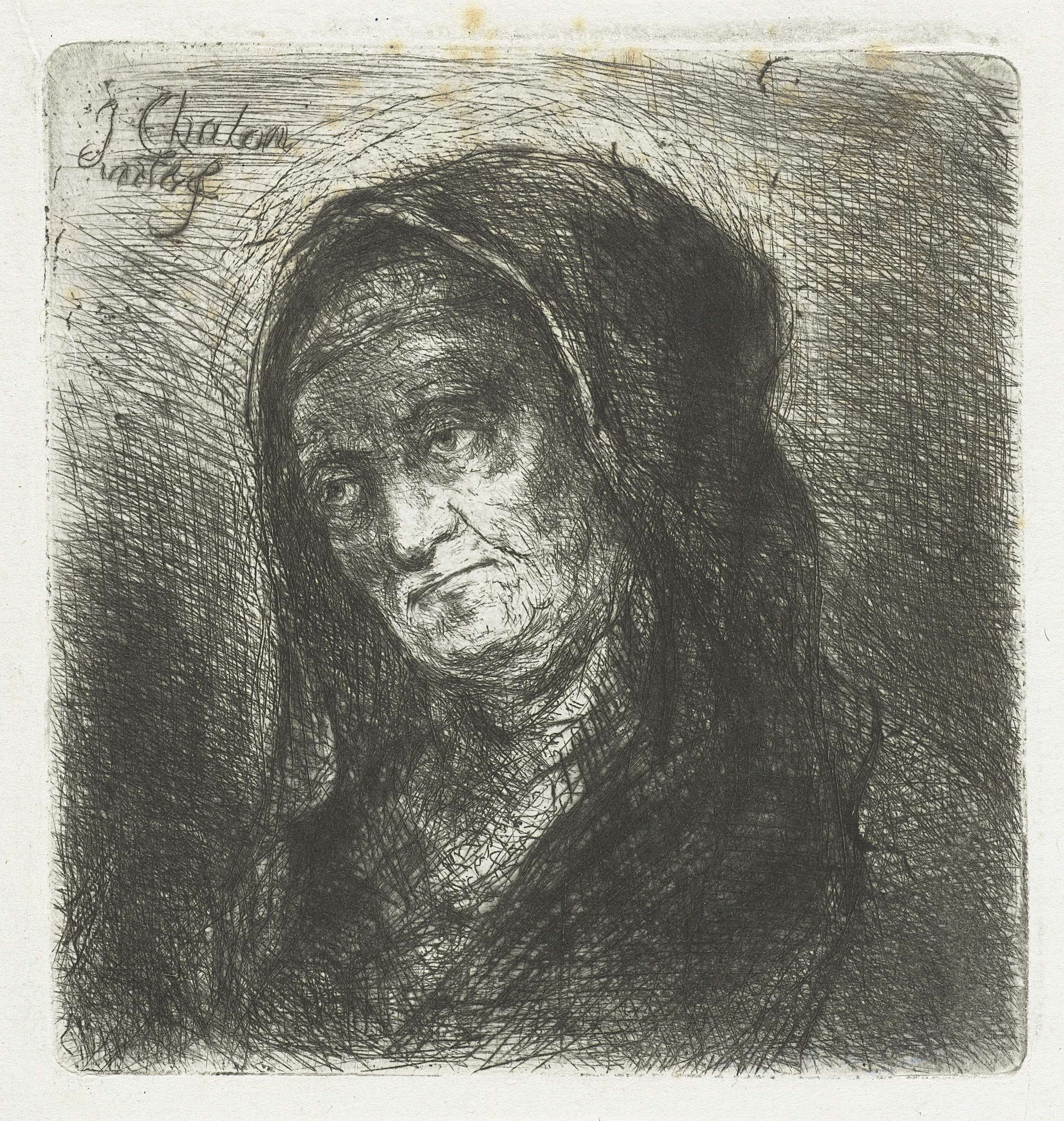 Portret van een oude vrouw met zwarte sluier. Buste naar links.