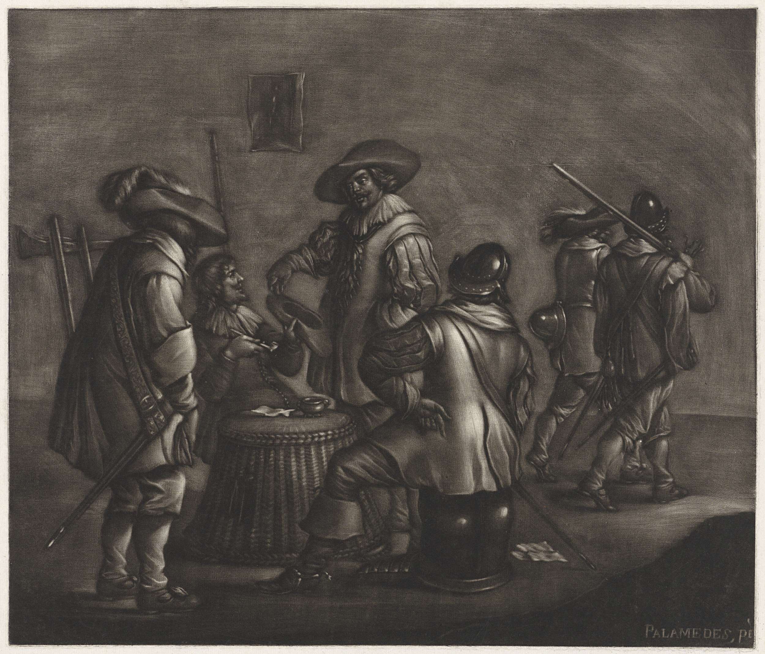 In een herberg zitten vier soldaten te praten en te roken rond een omgekeerde mand. Twee andere soldaten verlaten het vertrek. Aan de muur hangt een prent.