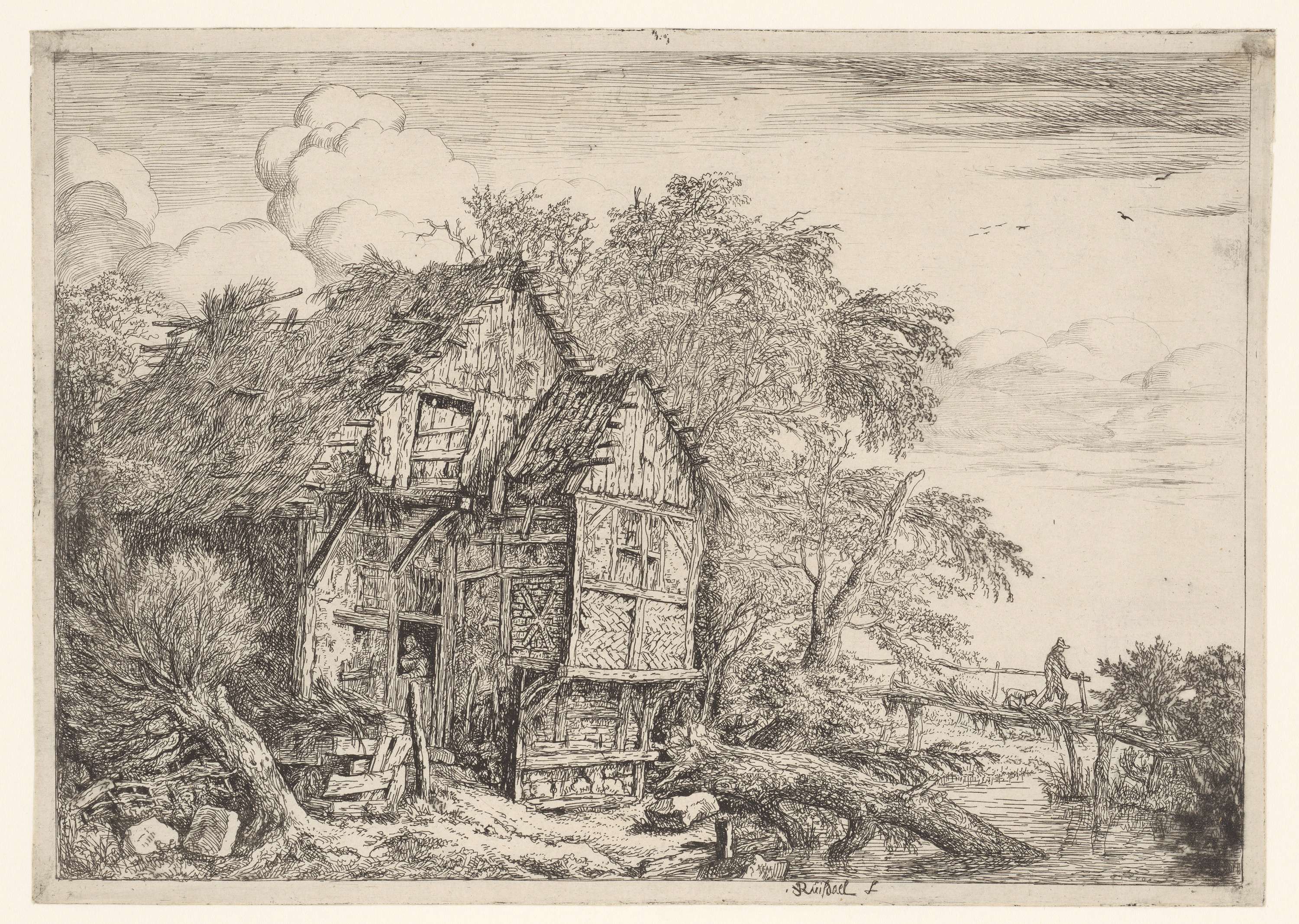 Een vervallen vakwerkhuis aan de oever. Over het water een bruggetje met een man en een hond.