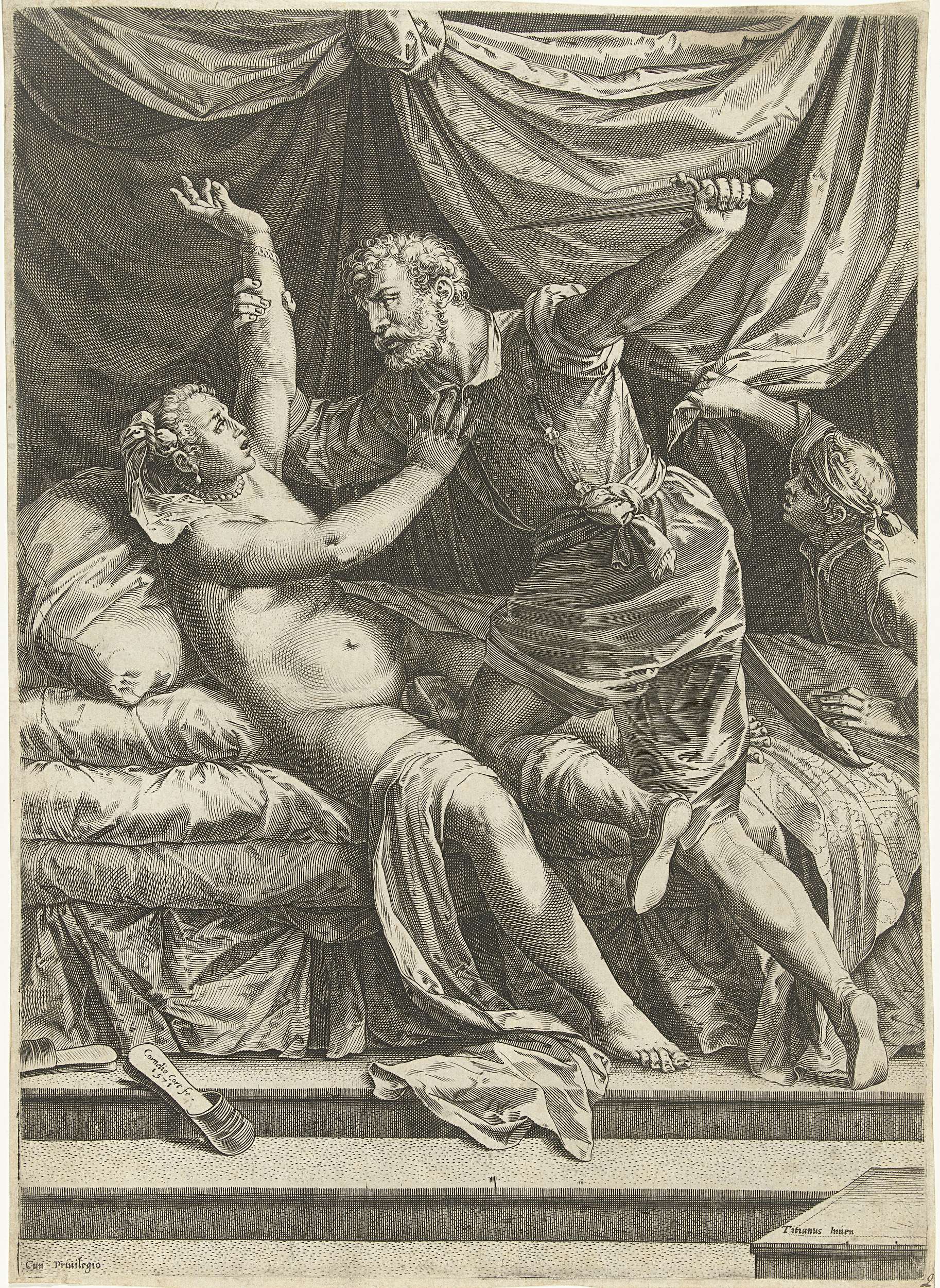 Sextus valt Lucretia, die naakt op een hemelbed ligt, aan met een dolk en dwingt haar zich aan hem te onderwerpen.