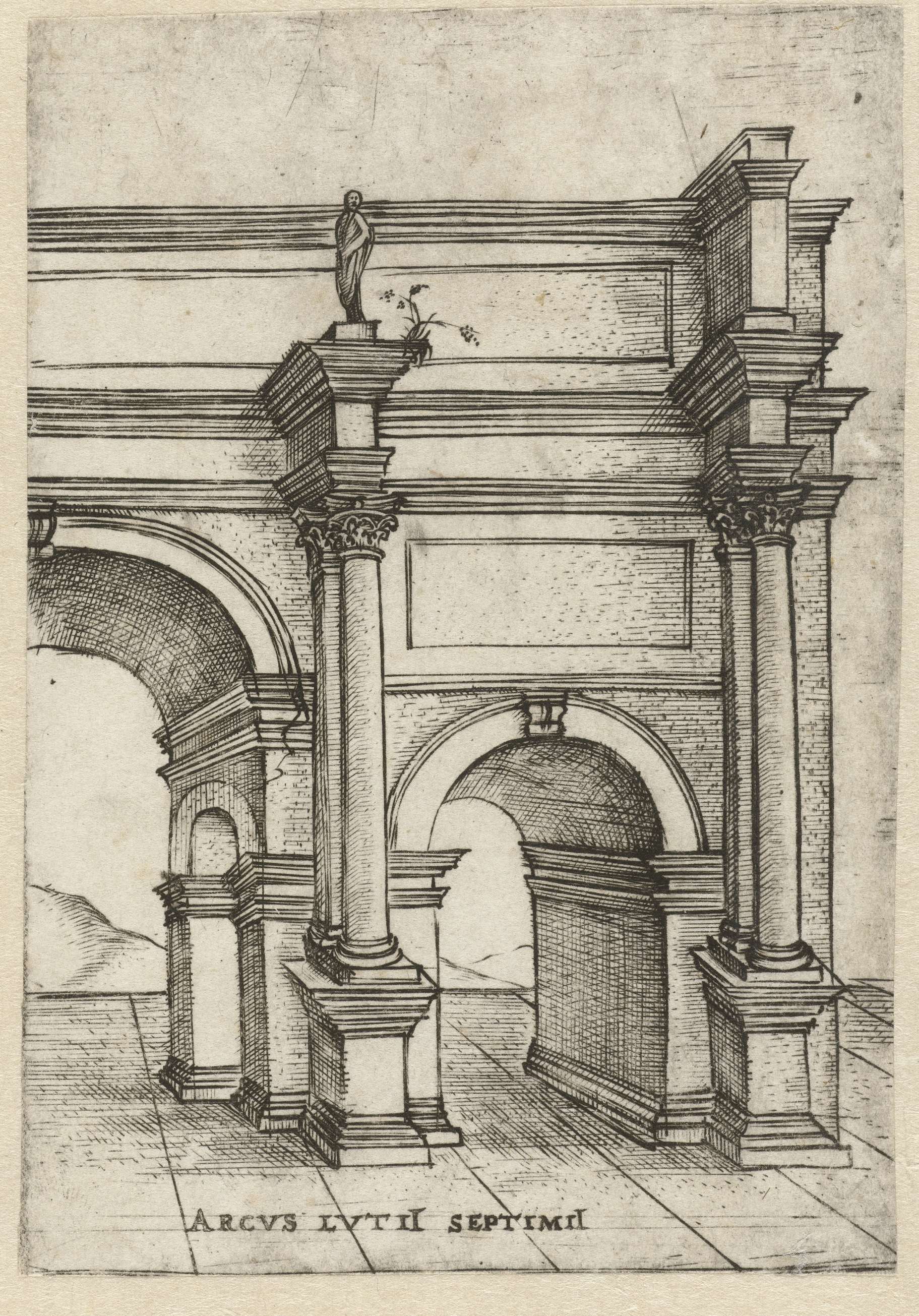 Deel van een klassieke triomfboog die, blijkens het Latijnse onderschrift, ter ere van Lutius Septimius is opgericht: twee doorgangen en enkele zuilen onder een architraaf. Deze prent is onderdeel van een serie prenten van antieke gebouwen.