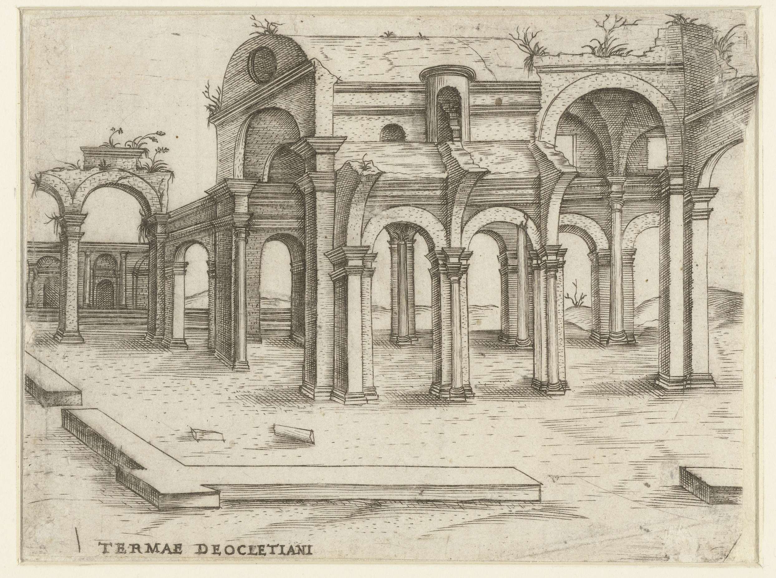 Vervallen klassiek badhuiscomplex, namelijk (blijkens het Latijnse onderschrift) de Thermen van Diocletianus: een gewelf op pilaren. Deze prent is onderdeel van een serie prenten van antieke gebouwen.
