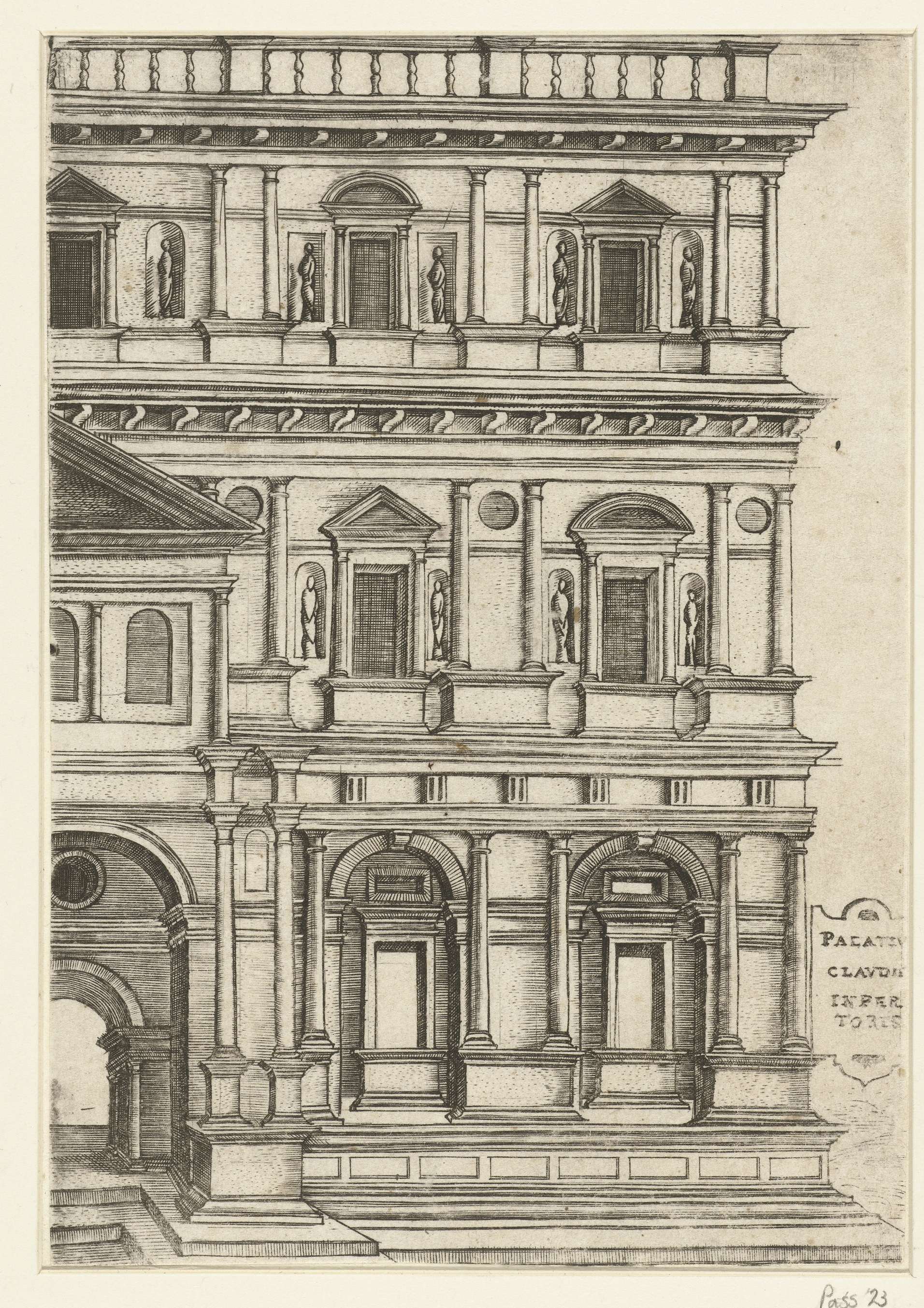 Deel van het exterieur van een klassiek paleis dat, blijkens het Latijnse opschrift rechts, aan keizer Claudius toebehoord heeft: een toegangspoort in een rechthoekig gebouw met twee verdiepingen. Deze prent is onderdeel van een serie prenten van antieke gebouwen.