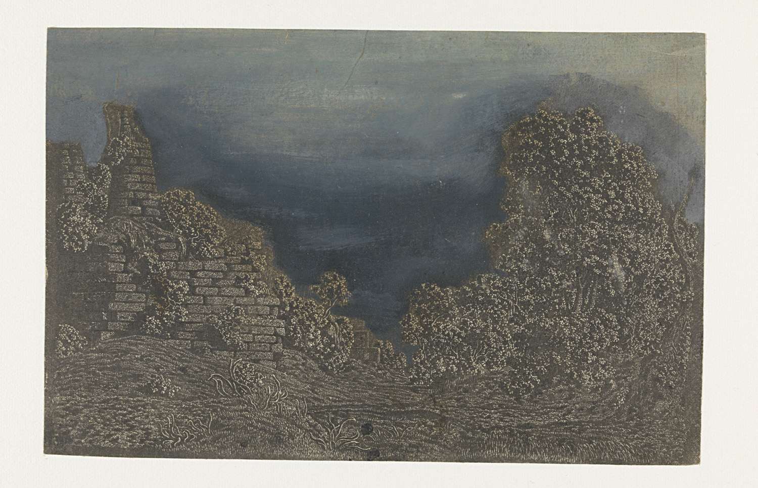 Voorgesteld is een antieke tombe aan de Via Appia Antica bij Albano. De lucht is afgedekt met licht- en donkerblauwe olieverf. Vermoedelijk is de beschildering onvoltooid en was het de bedoeling om ook de ruïnes en de vegetatie nog van kleur te voorzien.