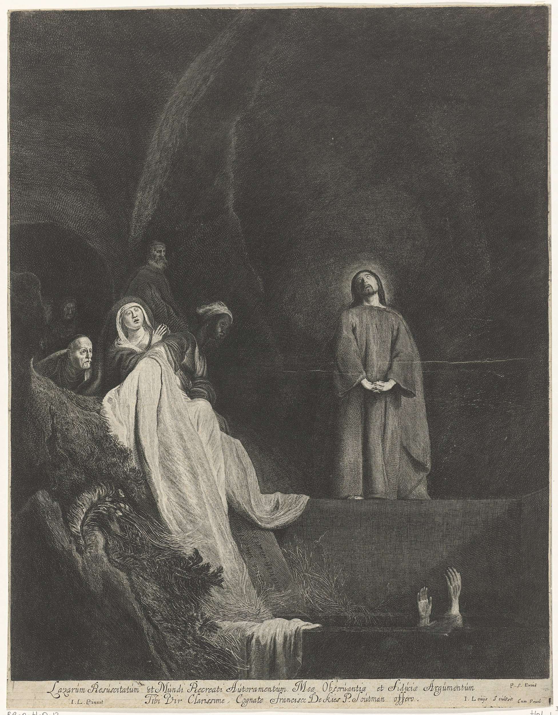 Christus staat met gevouwen handen bij het graf van de dode Lazarus en beveelt hem terug tot leven te komen (Joh. 11:43-44). Links kijken toeschouwers geschokt toe. In de marge een tweeregelig onderschrift.