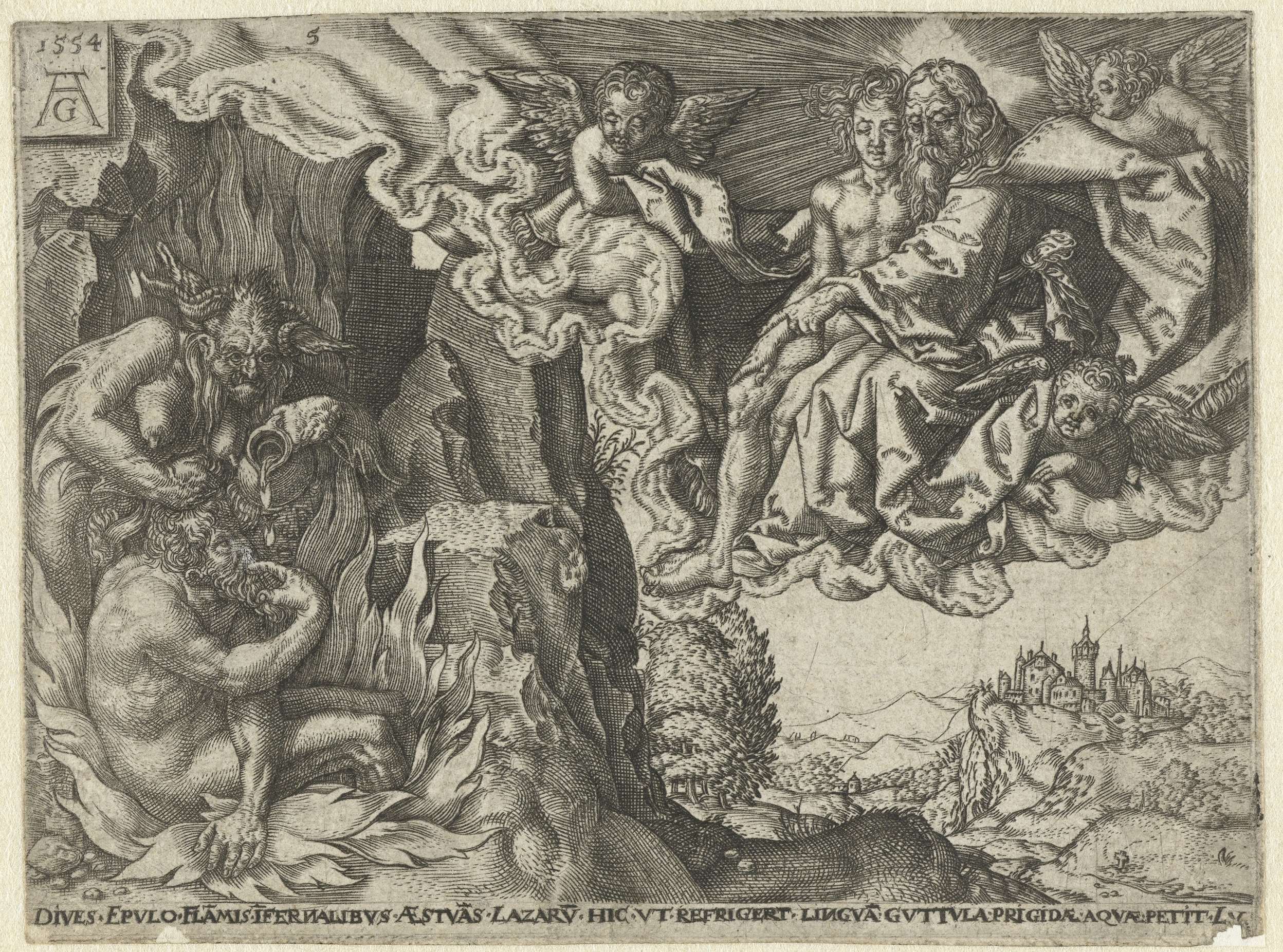 De rijke man, zittend in de vlammen van de hel, wijst naar zijn mond en vraagt om water, een duivel trekt aan zijn haar en druppelt water uit een kan. Aan de hemel in een wolk Abraham met Lazarus en drie engelen. Onder de voorstelling de tekst: Dives epulo fla mis ifernalibus aestuas lazaru(s) hic ...