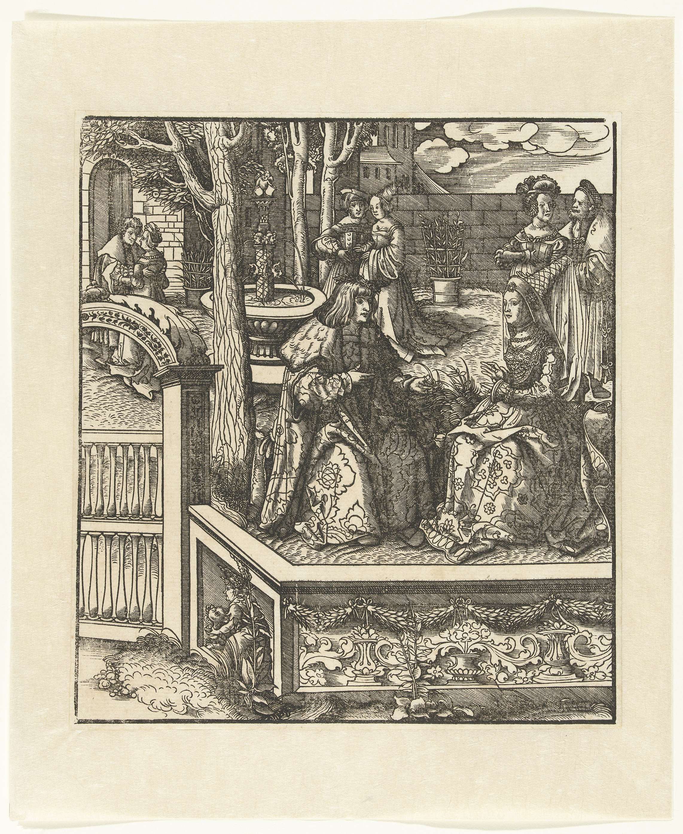 Maximiliaan en zijn echtgenote Maria van Bourgondië zitten in de tuin van een paleis en leren elkaar hun taal. In de tuin lopen drie paren te wandelen.