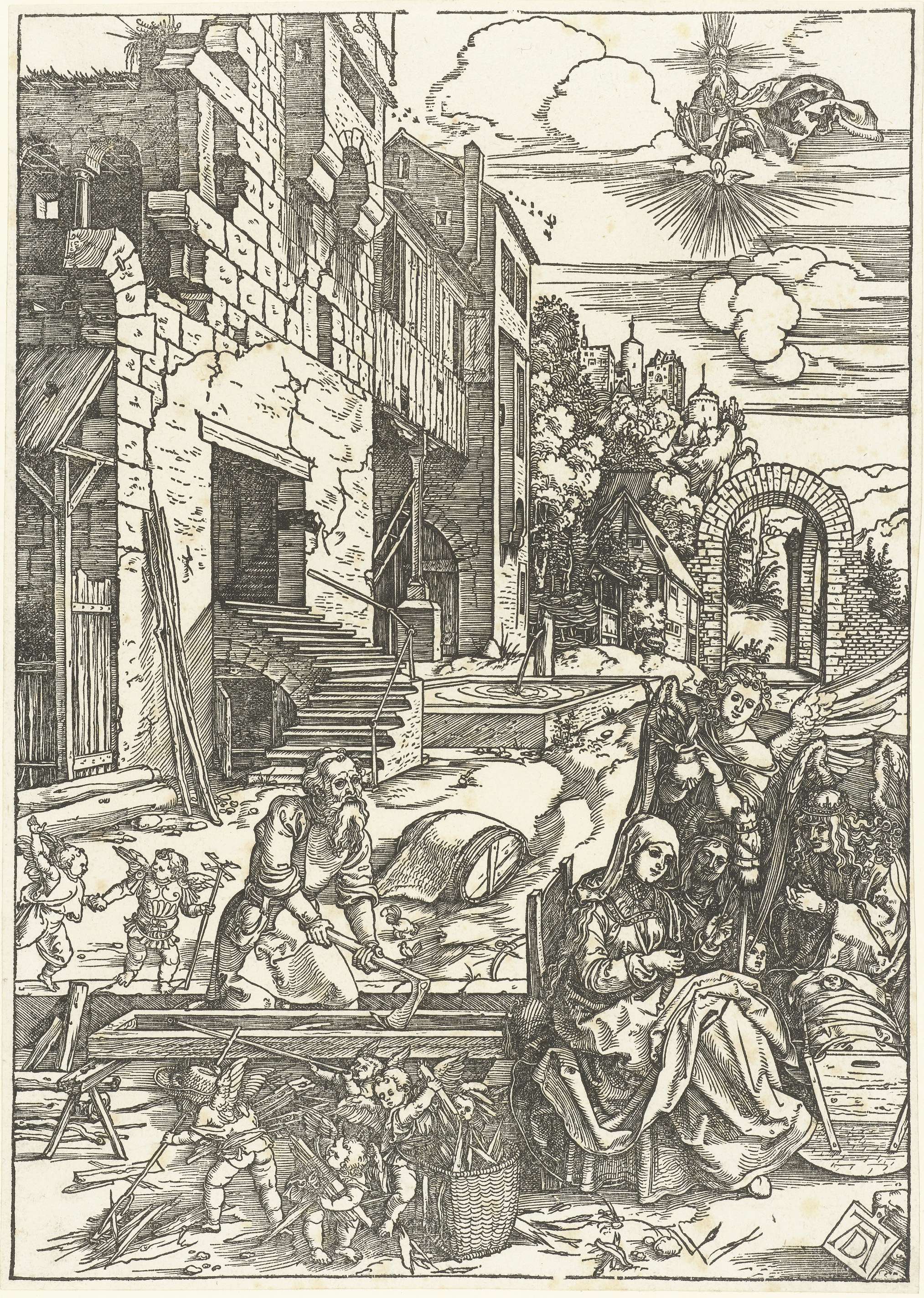 Voor een vervallen gebouw zit Maria naast enkele engelen te spinnen, terwijl ze met de voet het bedje waarin het Christuskind ligt laat wiegen. Achter haar werkt Jozef aan een trog, geholpen door putti. Deze prent is onderdeel van een serie van 20 prenten, bestaand uit een titelprent en 19 prenten met scènes uit het ...