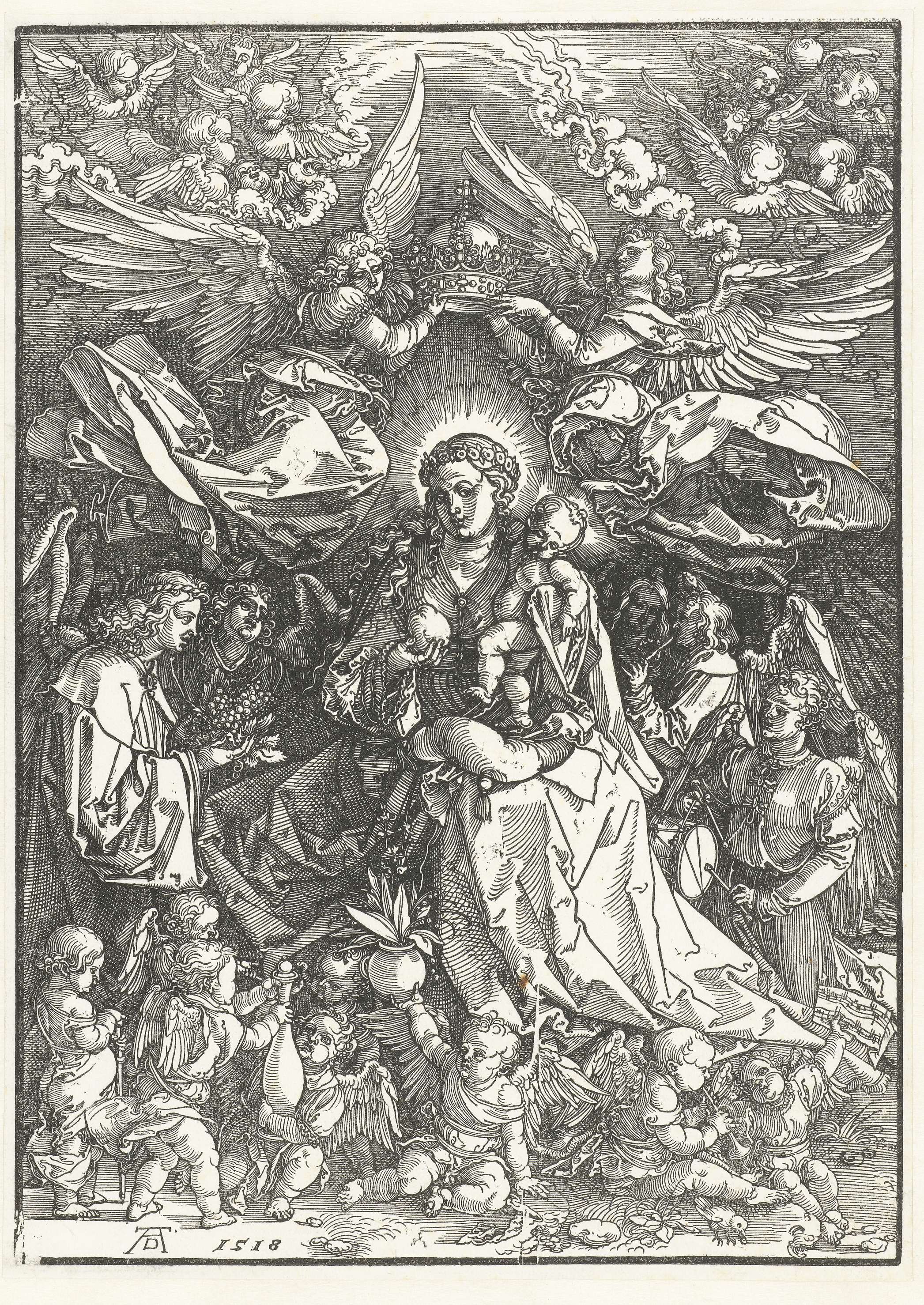 Maria, het Christuskind staand op de schoot, is omgeven door vele grote en kleine engelen. Twee van hen kronen haar, enkelen maken muziek en één biedt haar druiven aan.