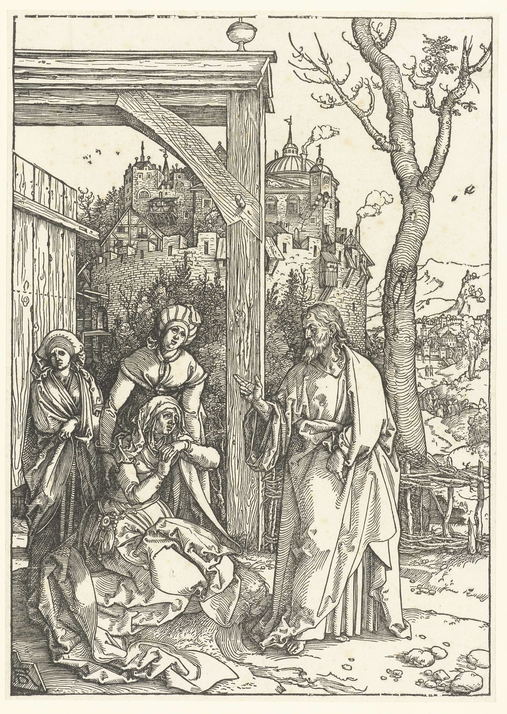 Maria knielt met van verdriet vertrokken gezicht voor Christus, die afscheid van haar neemt. Twee vrouwen (Martha en Maria Magdalena) staan achter Maria. Op de achtergrond een burcht of stad. Deze prent is onderdeel van een serie van 20 prenten, bestaand uit een titelprent en 19 prenten met scènes uit het leven van Maria.