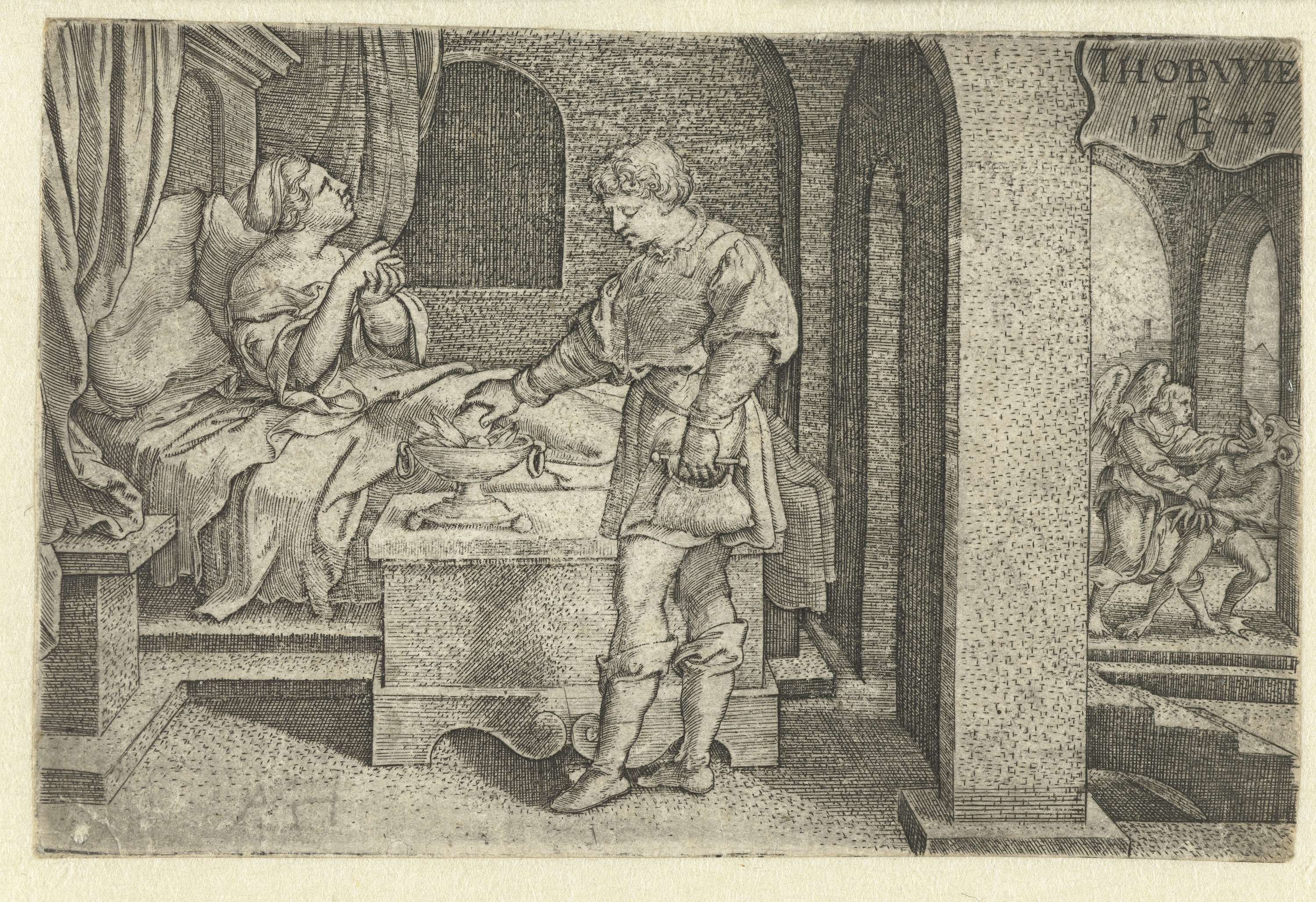 Tobias verbrandt het hart en de lever van de eerder gevangen vis op een schaal met wierook in de slaapkamer. Sara ligt in bed in afwachting van de verlossing van de demon die haar betoverd had. In de galerij naast het vertrek stuurt de engel Rafaël de demon weg (Tobit 8:2).