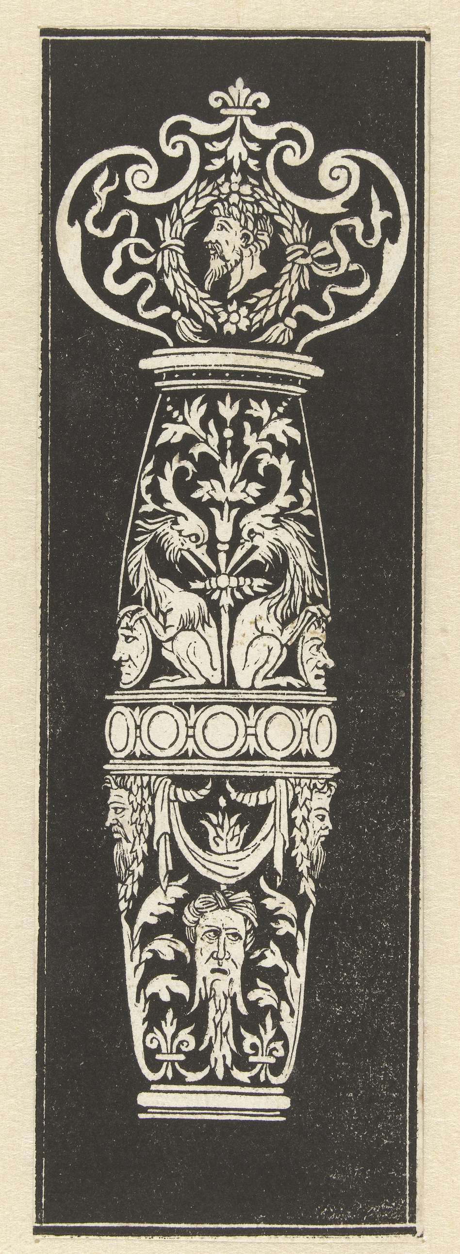 Op de knop bevindt zich een lauwerkrans met het hoofd van een man. Eén van 3 bladen. De decoratie, bestaande uit arabesken, grotesken, wapentrofeeën en mascarons, is wit op een zwart fond.