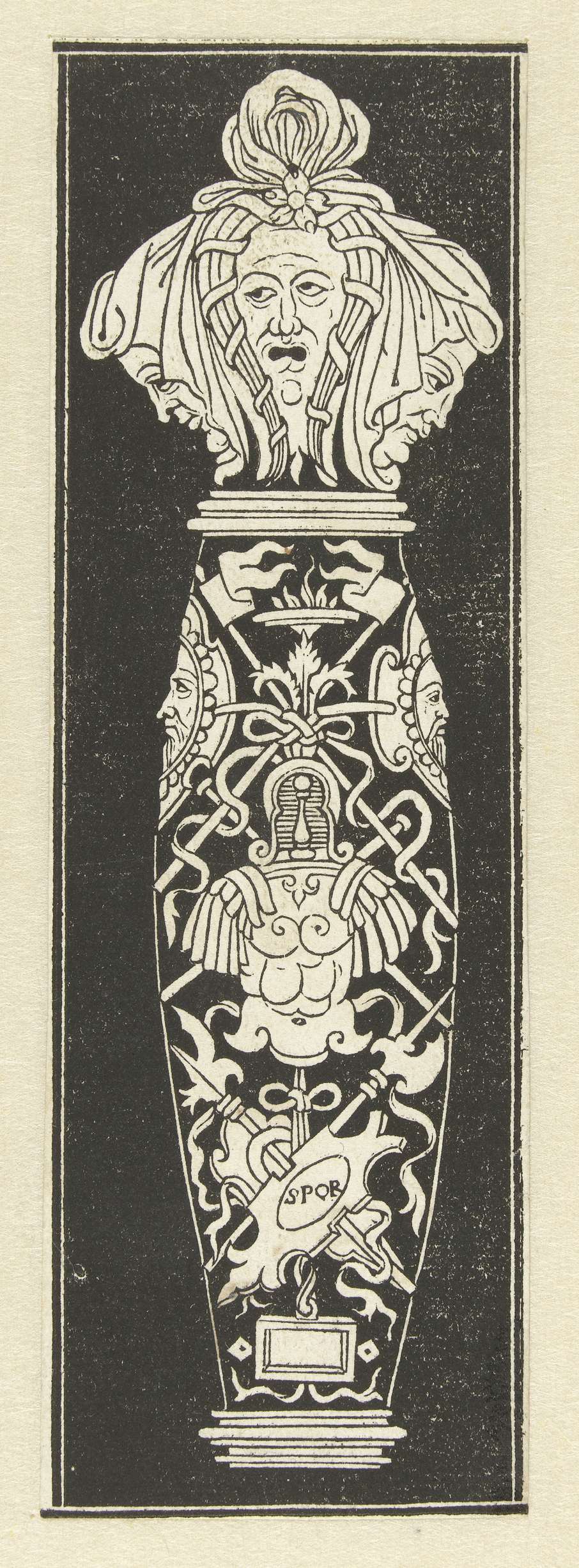 De knop is gedecoreerd met drie mascarons. Eén van 3 bladen. De decoratie, bestaande uit arabesken, grotesken, wapentrofeeën en mascarons, is wit op een zwart fond.