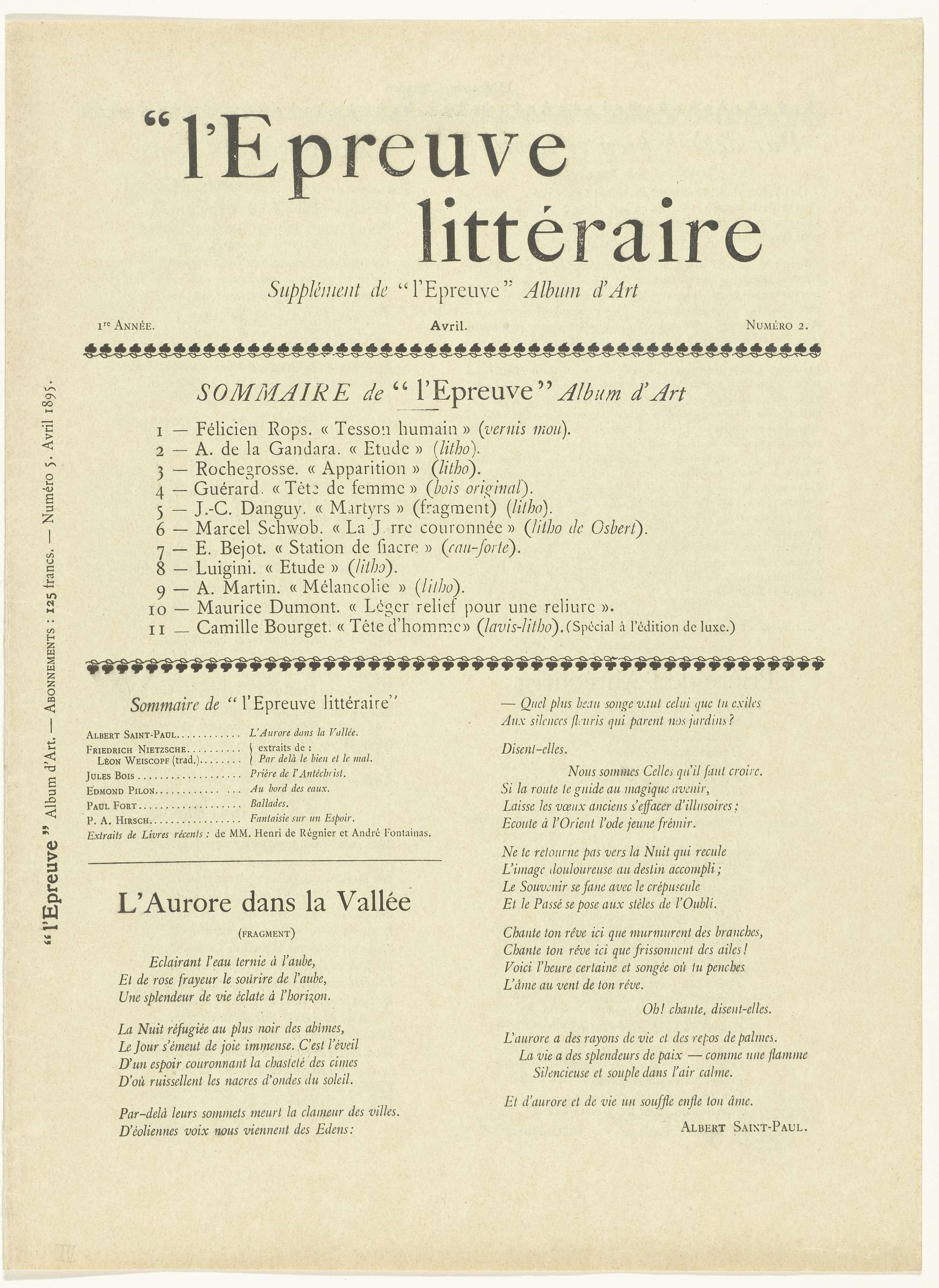 Het tijdschrift L'Epreuve verscheen maandelijks van december 1894- december 1895 en besteedde aandacht aan kunst en literatuur. Vanaf maart 1895 verscheen het album met tien originele prenten van bekende kunstenaars als een losse bijlage, deze wordt op de voorpagina genoemd. In deze vijfde uitgave van april 1895 staan verschillen gedichten en boekcitaten. Op de voorpagina ...