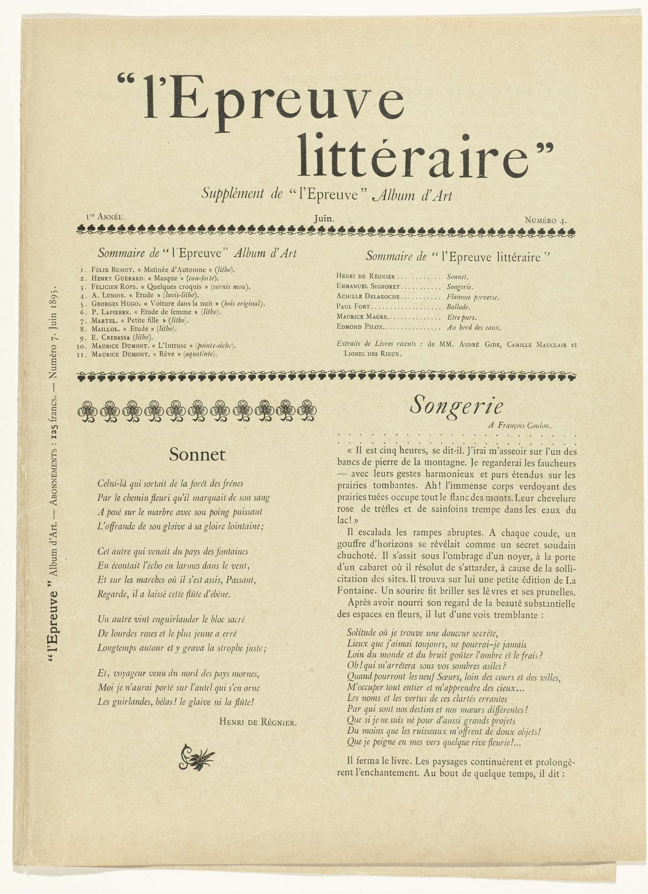 Het tijdschrift L'Epreuve verscheen maandelijks van december 1894- december 1895 en besteedde aandacht aan kunst en literatuur. Vanaf maart 1895 verscheen het album met tien originele prenten van bekende kunstenaars als een losse bijlage, deze wordt op de voorpagina genoemd. In deze zevende uitgave van juni 1895 staan verschillen gedichten en boekcitaten. Op de voorpagina ...