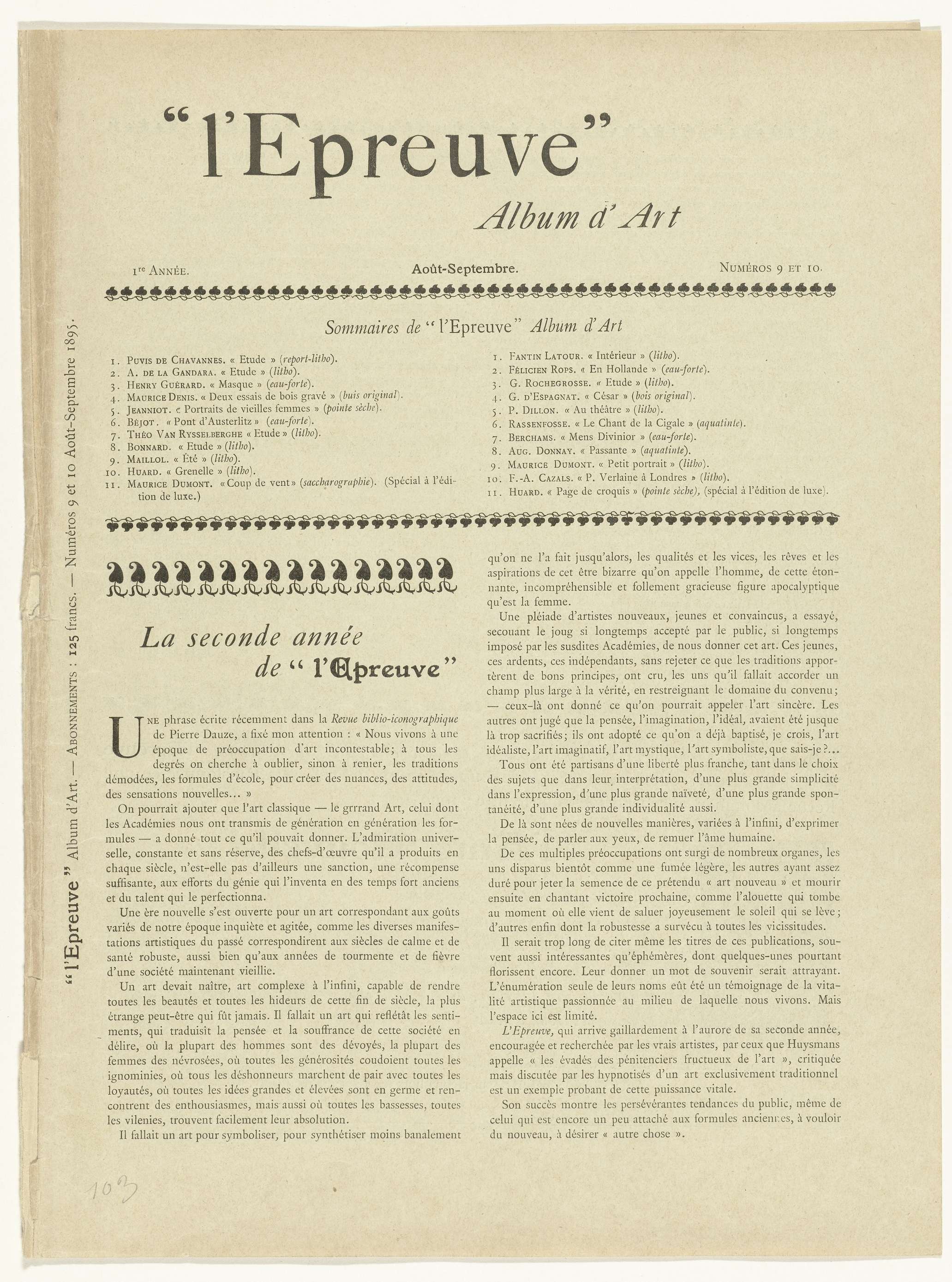 Het tijdschrift L'Epreuve verscheen maandelijks van december 1894- december 1895 en besteedde aandacht aan kunst en literatuur. In dit geval zijn twee edities in een nummer ogenomen, de negende en tiende uitgave van respectievelijk de maanden augustus en september 1895. Bij het tijdschrift verscheen per nummer een album met tien originele prenten van bekende kunstenaars. ...