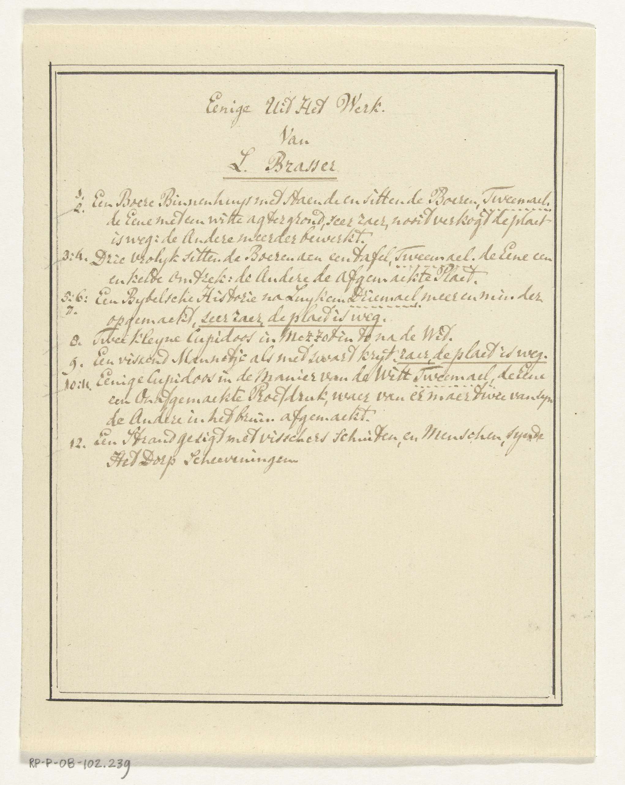 Handgeschreven lijstje met werken van Leendert Brasser