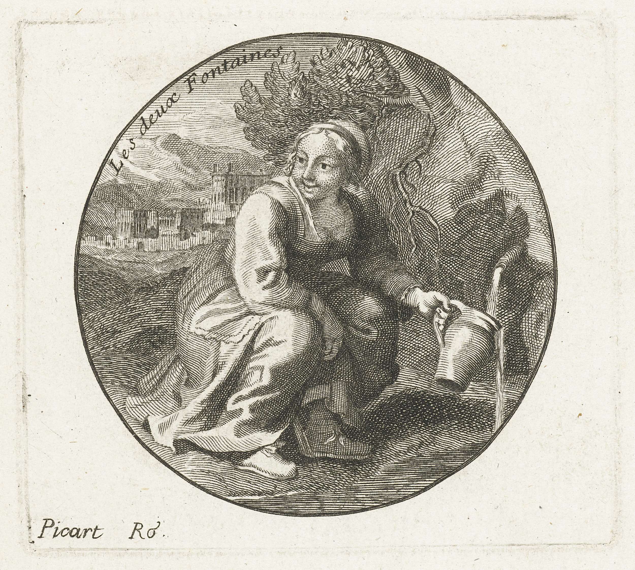 Een hurkende vrouw tilt haar rokken iets op en plast terwijl zij tegelijkertijd haar kruik vult met water bij een bron.