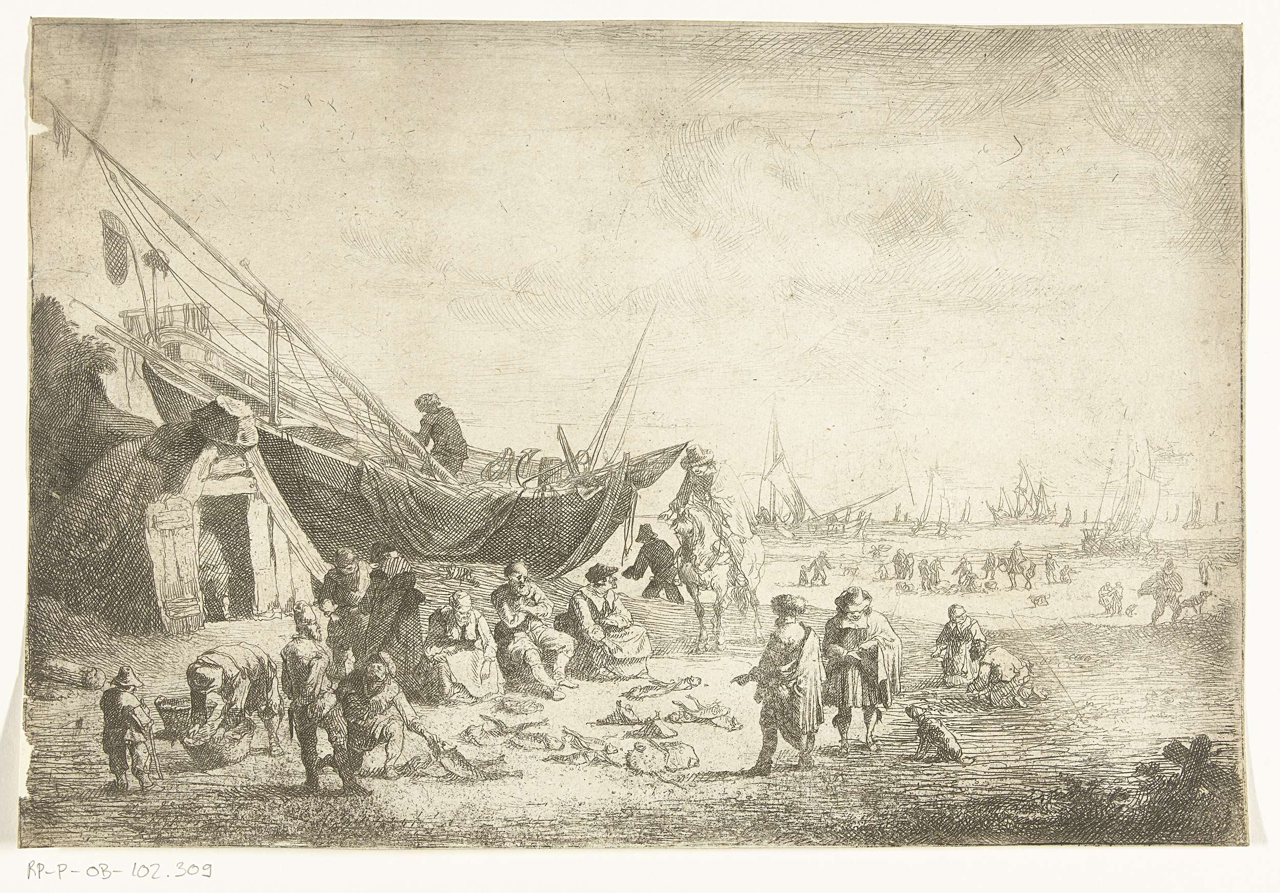 Twee heren doen inkopen op de vismarkt in Scheveningen. De vissers en vissersvrouwen zitten op kisten aan het strand, voor hun op de grond ligt de vis uitgestald. Op de achtergrond zijn schepen op zee en aan het strand te zien.
