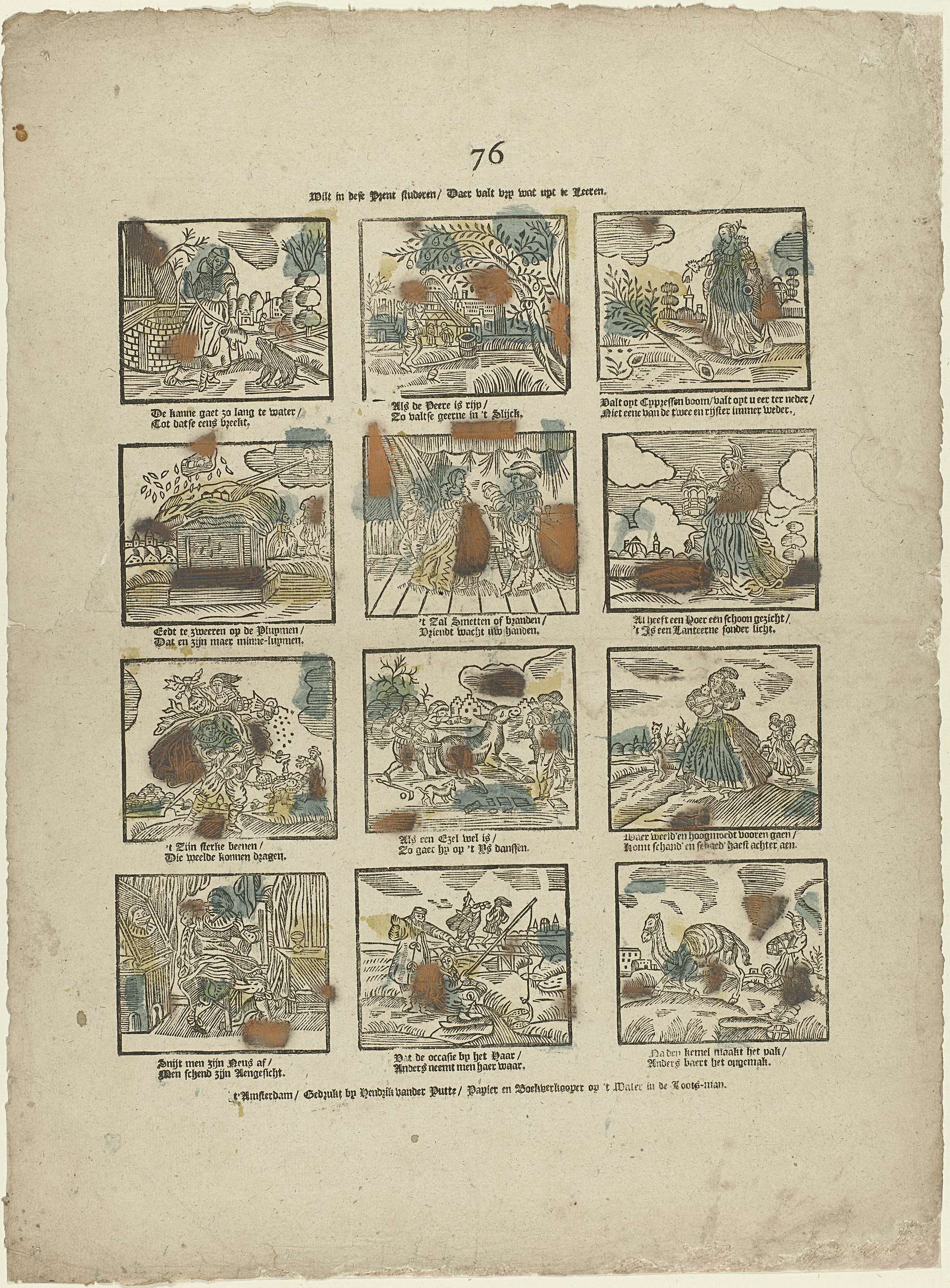 Blad met 12 verbeeldingen van spreekwoorden. Onder elke afbeelding een tweeregelig vers. Genummerd midden boven: 76.