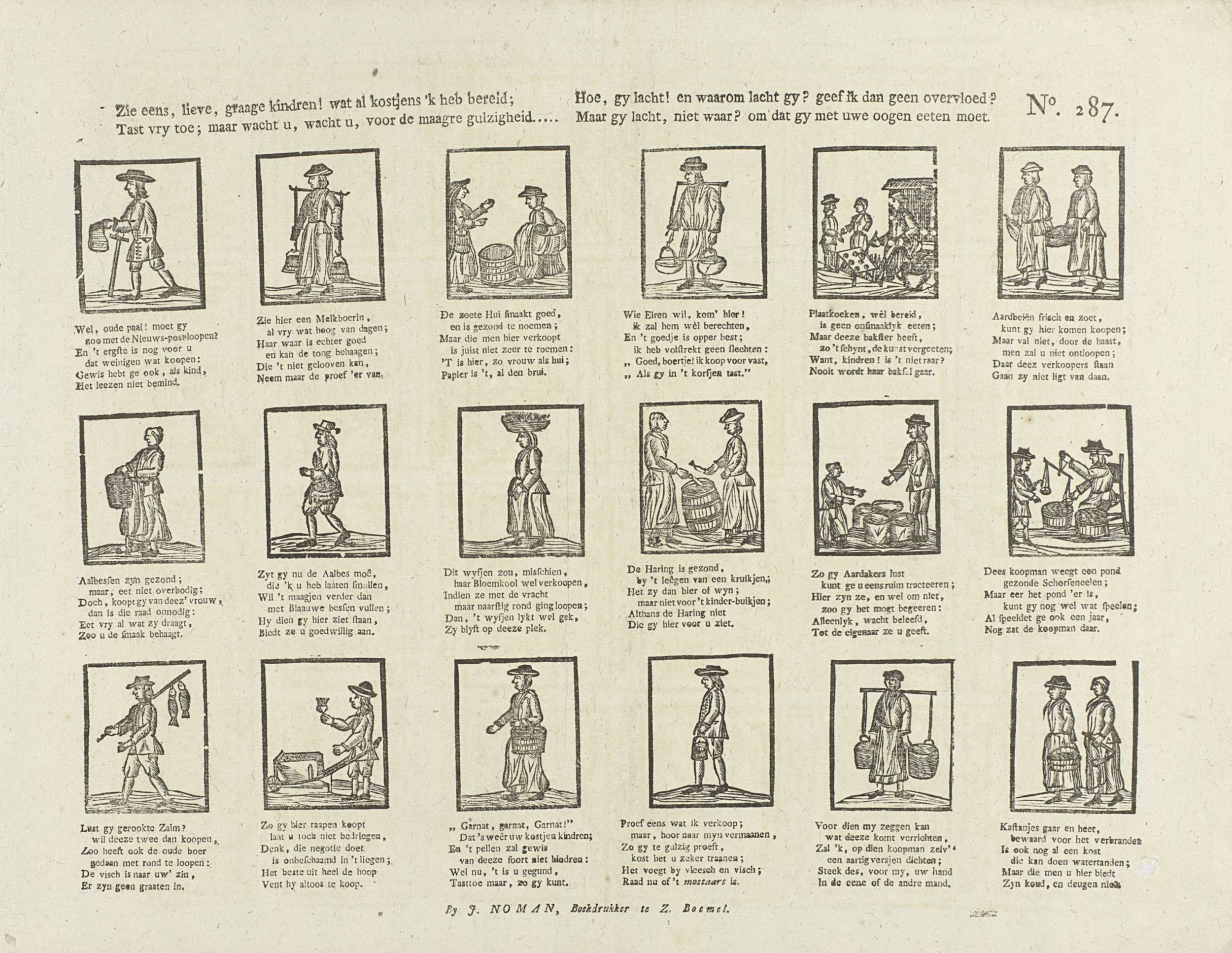 Blad met 18 voorstellingen van straatverkopers, zoals een eierenverkoper, een bloemkoolverkoopster en een mosterdverkoper. Onder elke afbeelding een zesregelig vers. Genummerd rechtsboven: No. 287.